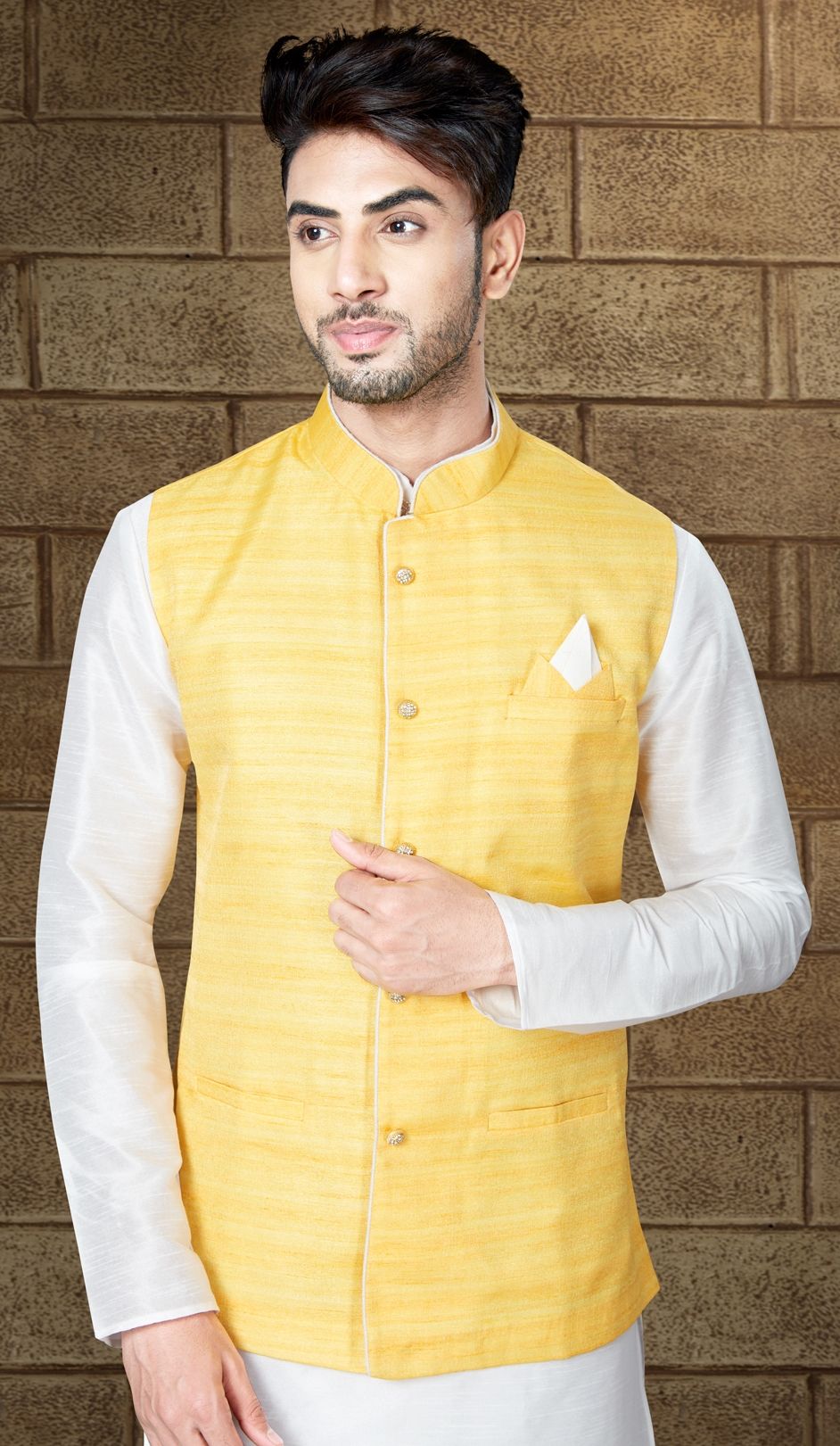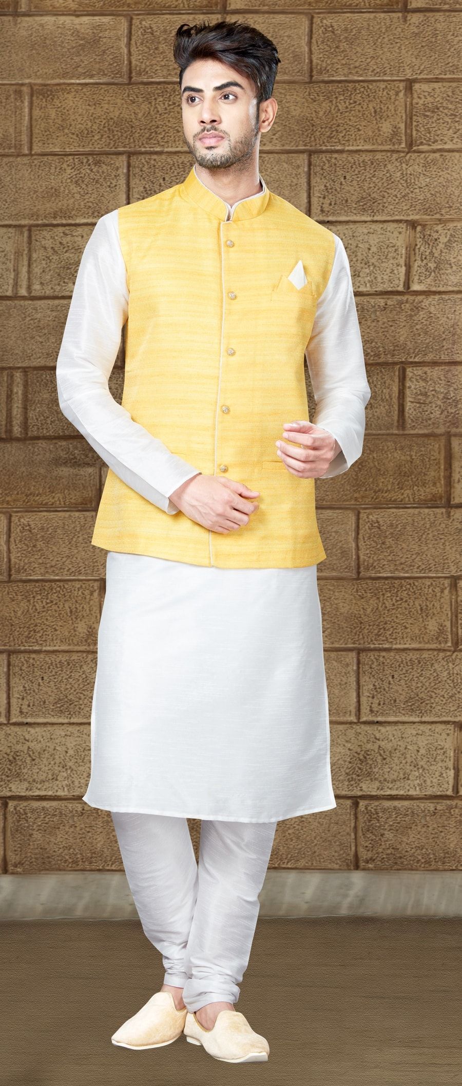 White and Off White, Yellow color Kurta Pyjama with Jacket in Art Dupion Silk fabric with Thread work