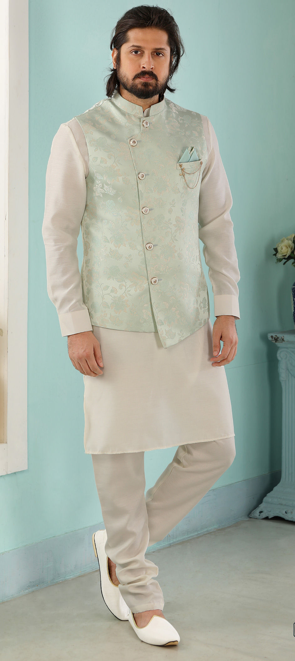 Beige and Brown, Green color Kurta Pyjama with Jacket in Art Silk, Silk fabric with Broches work