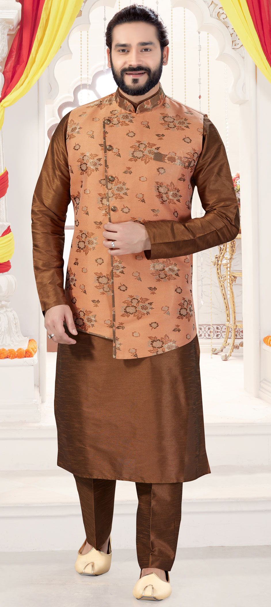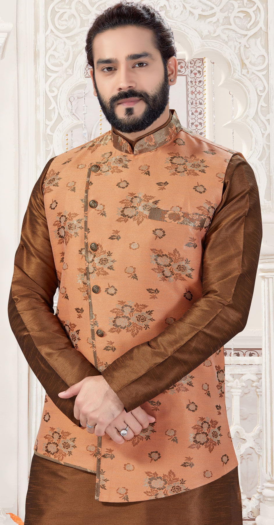 Beige and Brown color Kurta Pyjama with Jacket in Art Silk fabric with Floral, Printed work