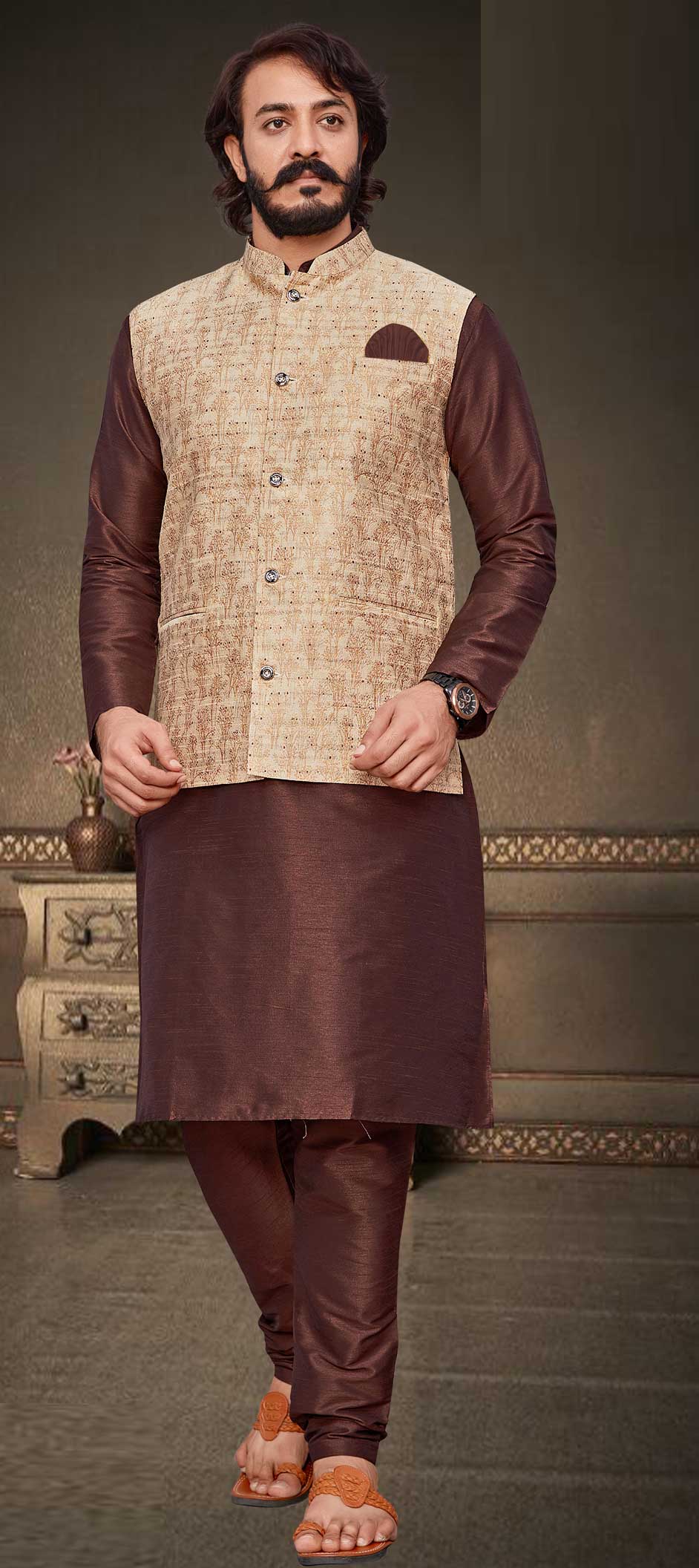 Beige and Brown color Kurta Pyjama with Jacket in Art Silk fabric with Weaving work