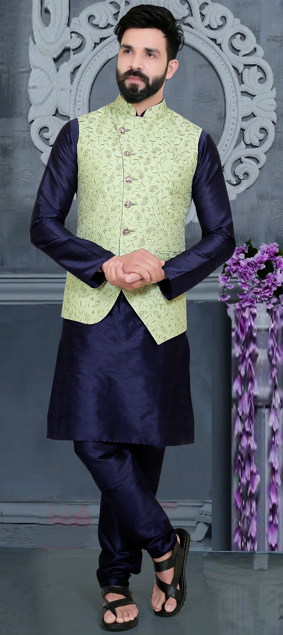 Blue color Kurta Pyjama with Jacket in Art Silk fabric with Thread work