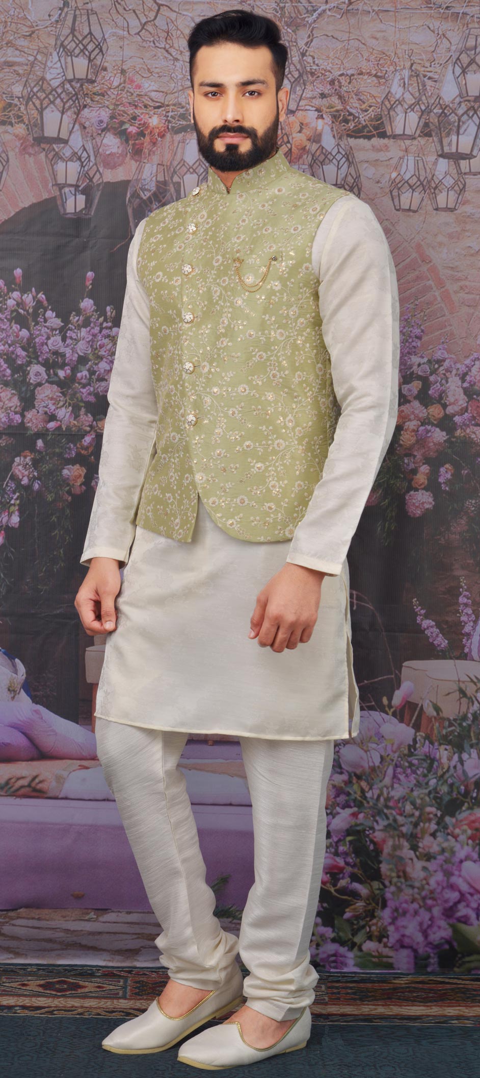 Beige and Brown, Green color Kurta Pyjama with Jacket in Art Silk fabric with Embroidered, Sequence, Thread work