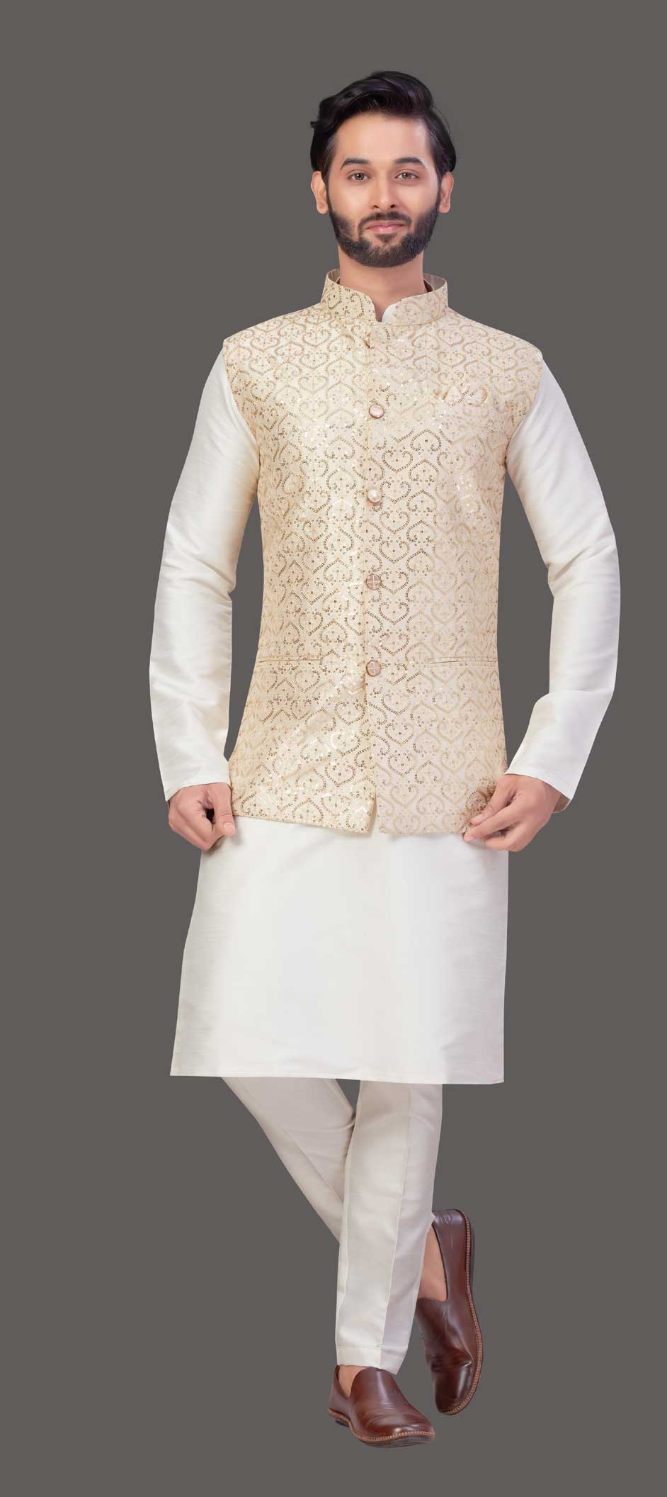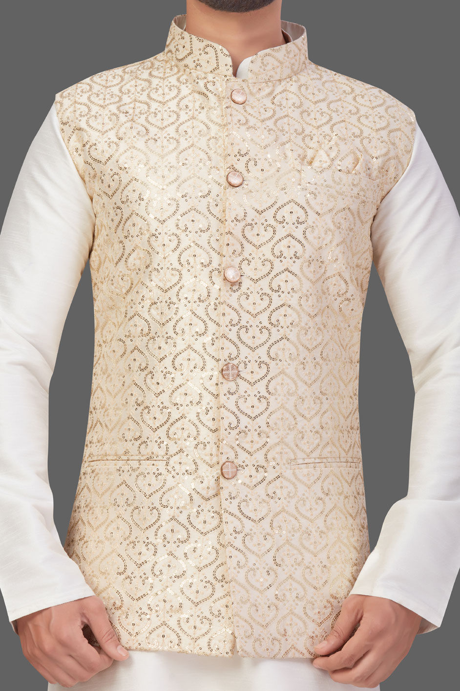 White and Off White color Kurta Pyjama with Jacket in Art Silk fabric with Sequence, Thread work