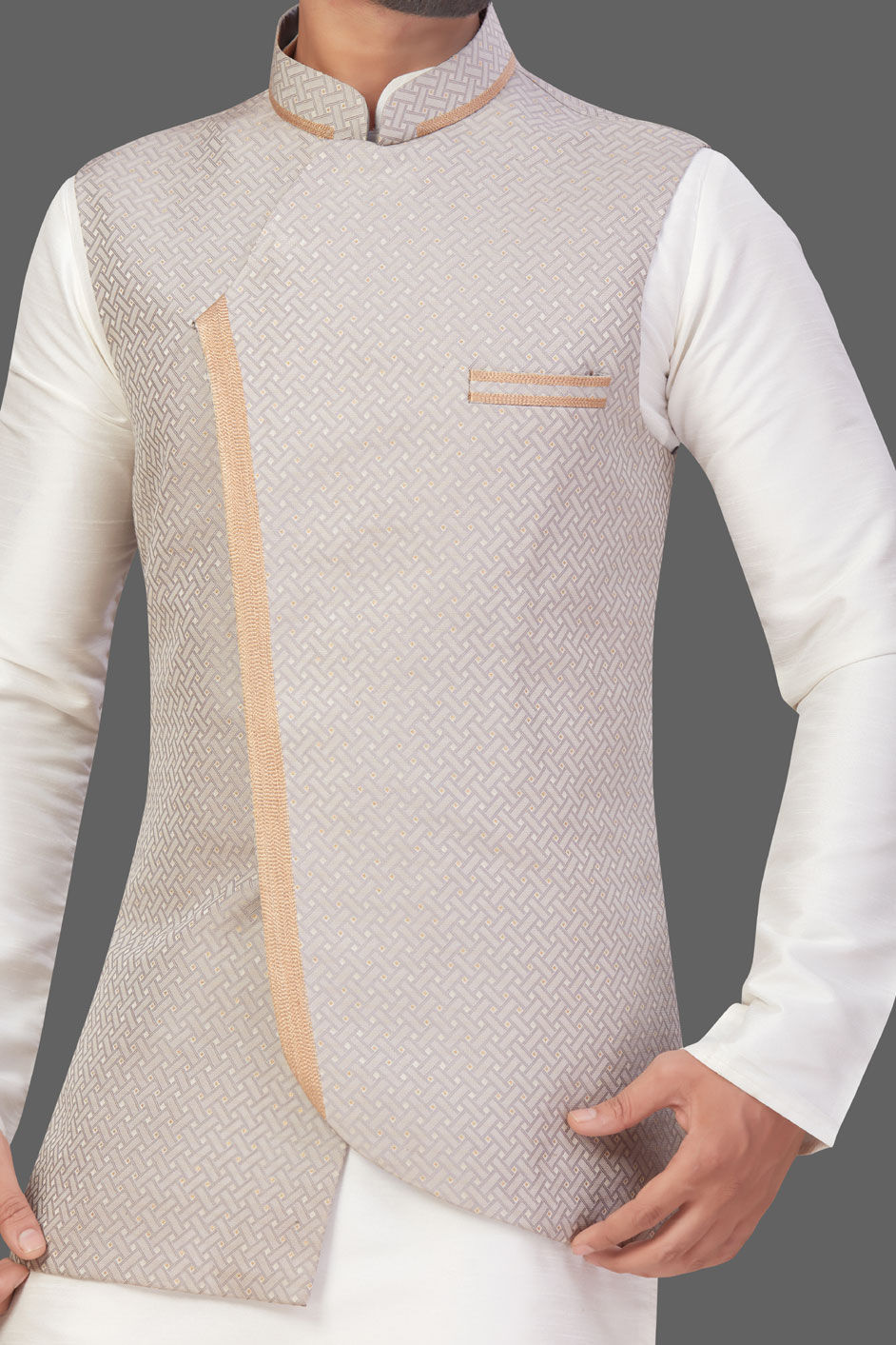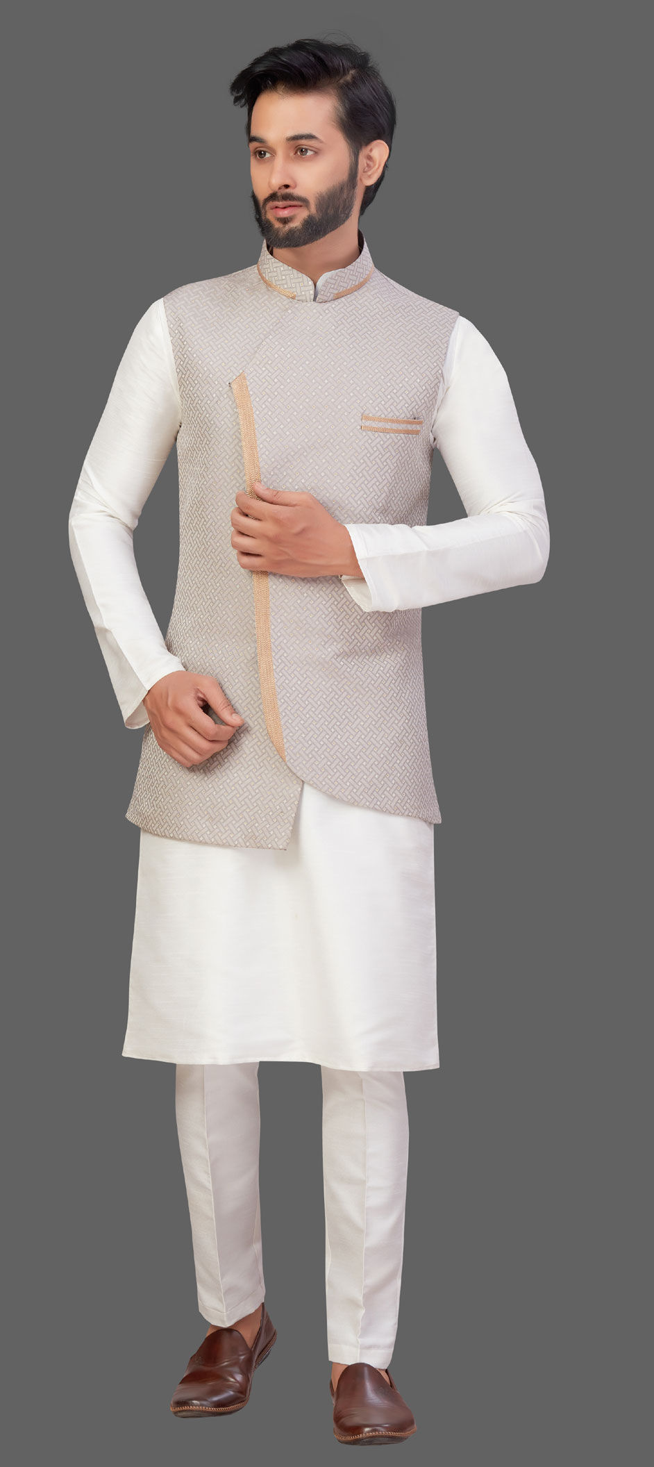White and Off White color Kurta Pyjama with Jacket in Art Silk fabric with Thread work
