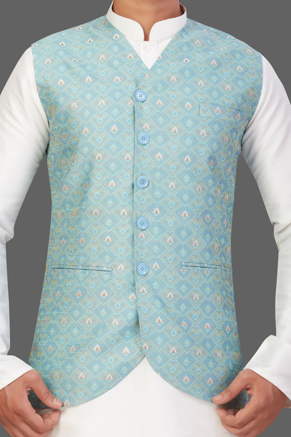 White and Off White color Kurta Pyjama with Jacket in Art Silk fabric with Embroidered, Thread work
