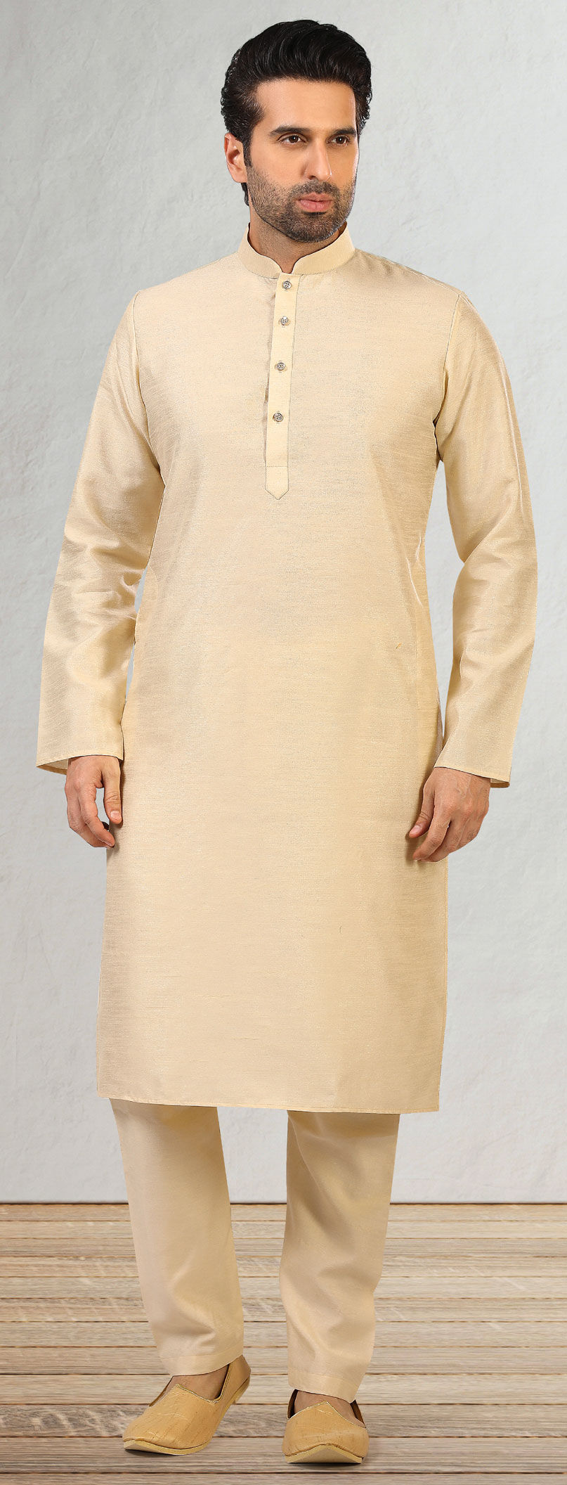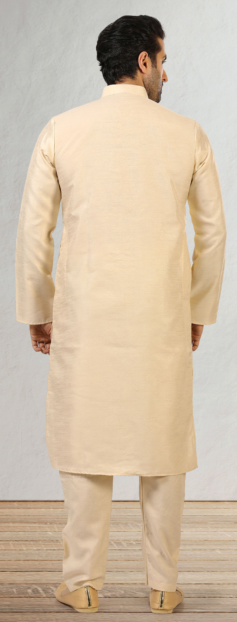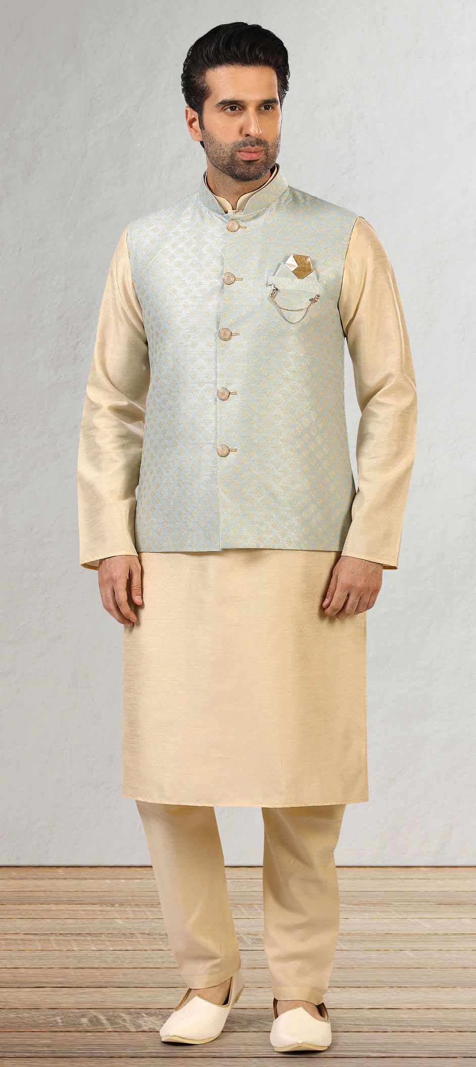 Beige and Brown, Blue color Kurta Pyjama with Jacket in Banarasi Silk fabric with Weaving work