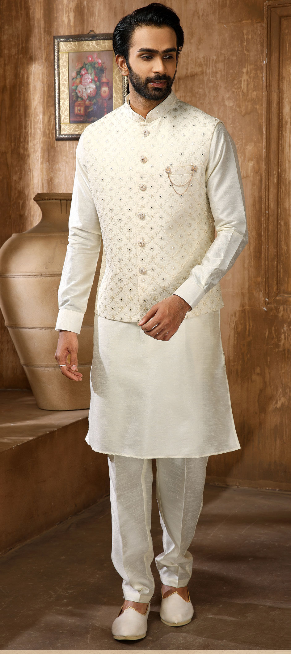 White and Off White color Kurta Pyjama with Jacket in Banarasi Silk fabric with Embroidered work
