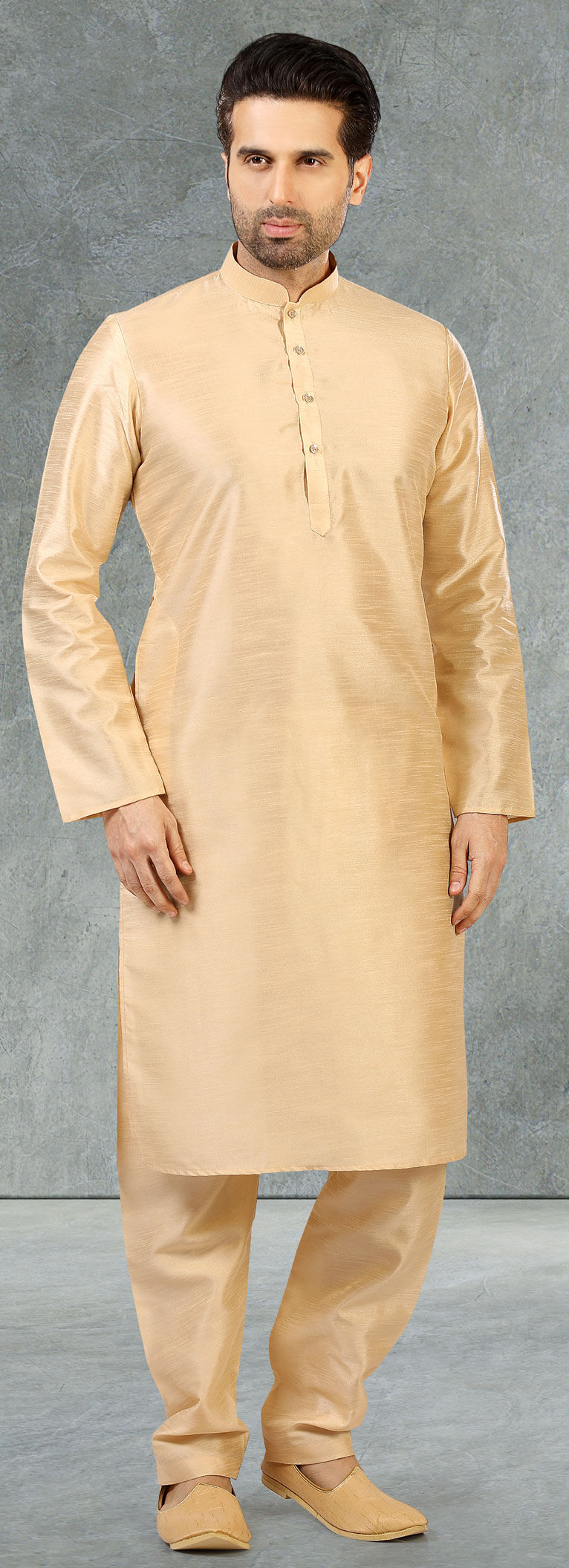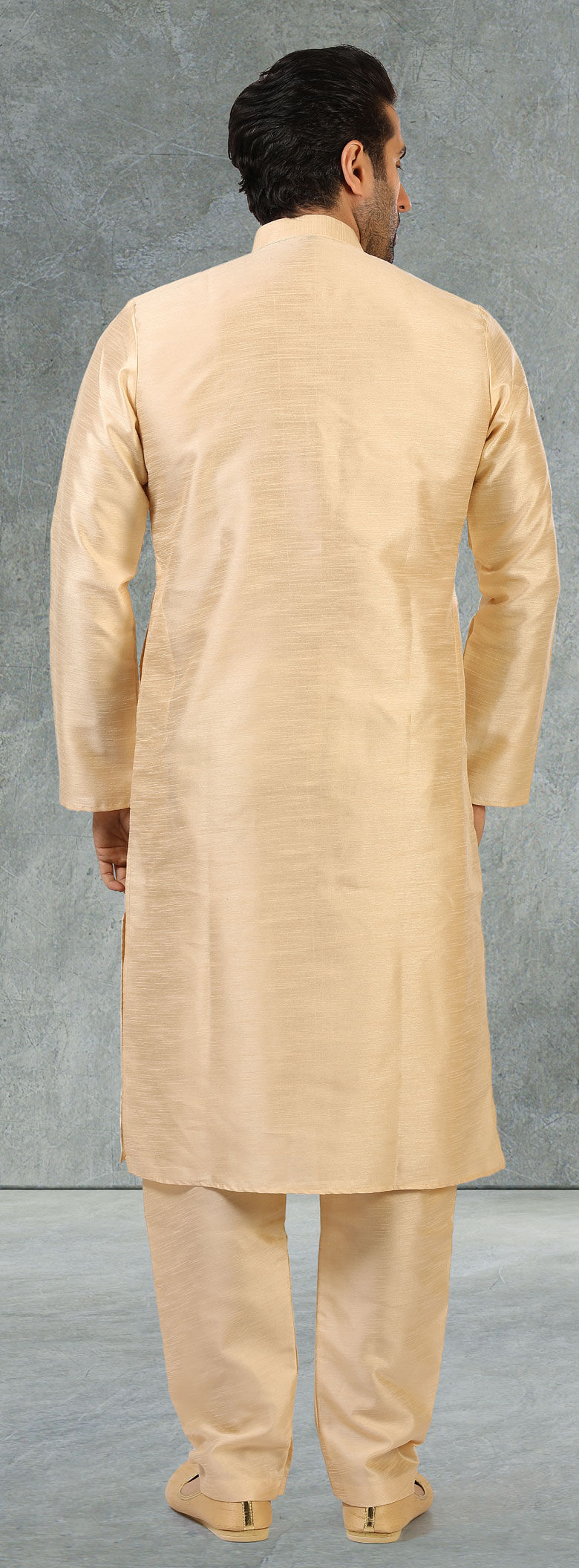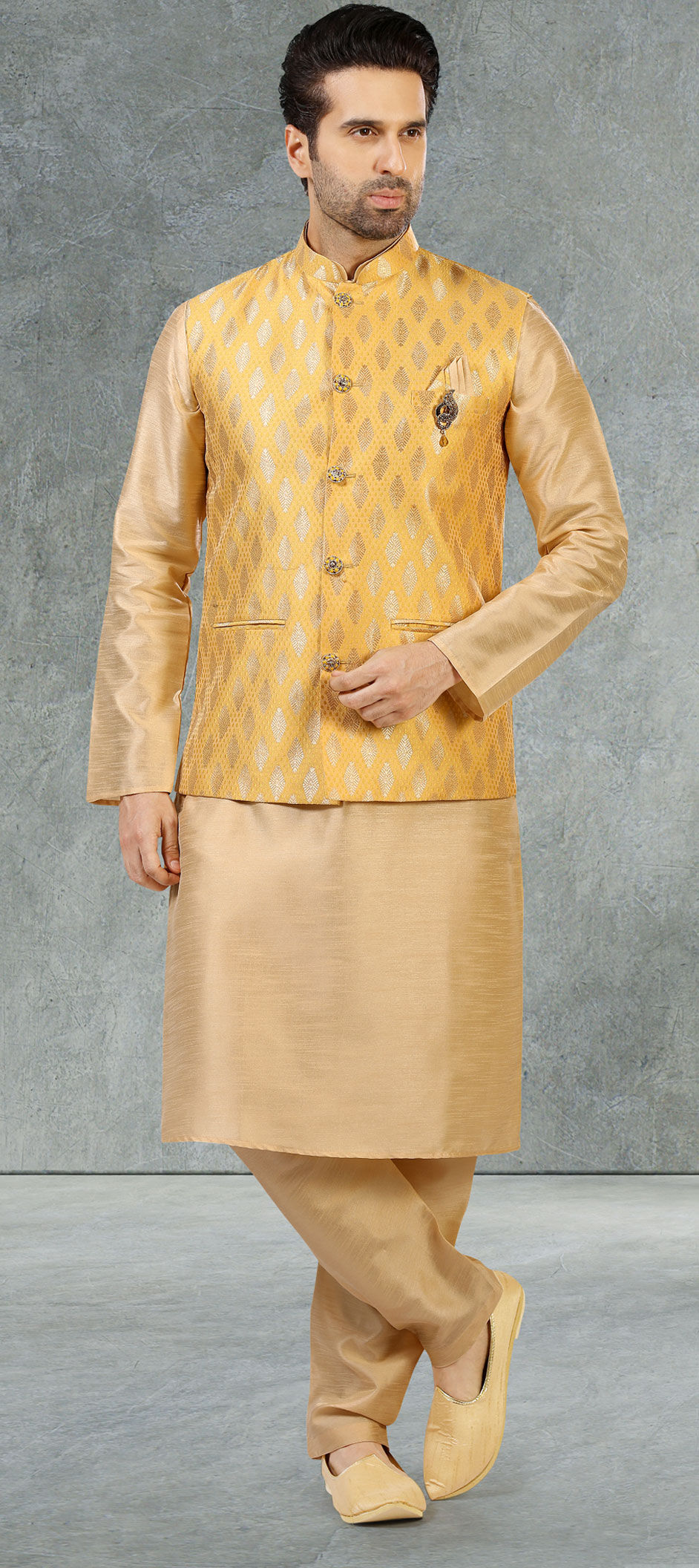 Beige and Brown, Yellow color Kurta Pyjama with Jacket in Banarasi Silk fabric with Weaving work