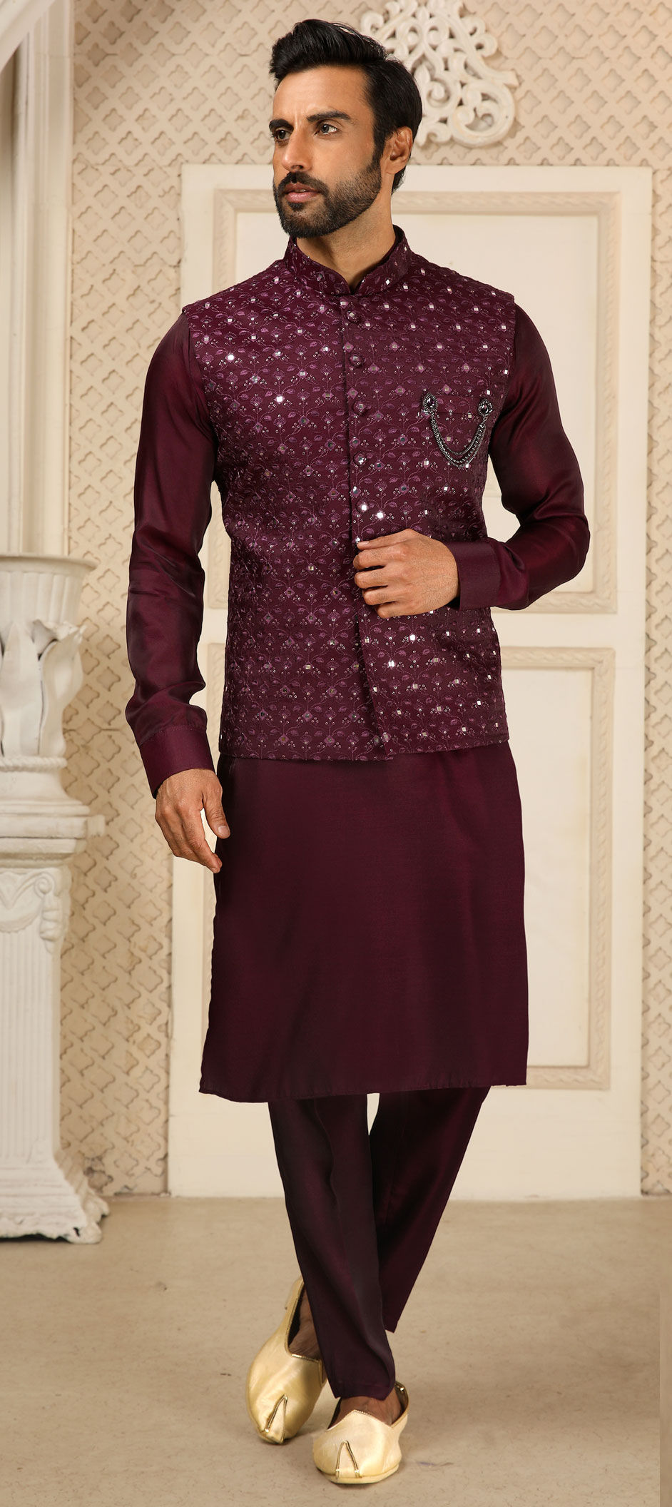 Red and Maroon color Kurta Pyjama with Jacket in Banarasi Silk fabric with Mirror work