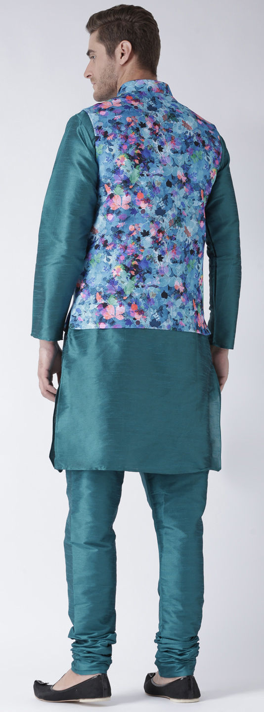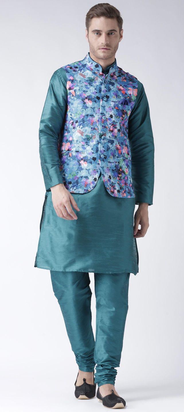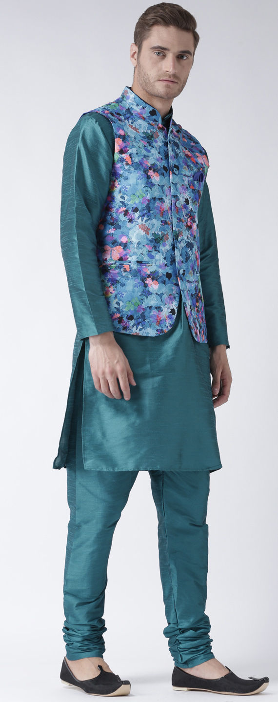 Blue color Kurta Pyjama with Jacket in Blended fabric with Thread work