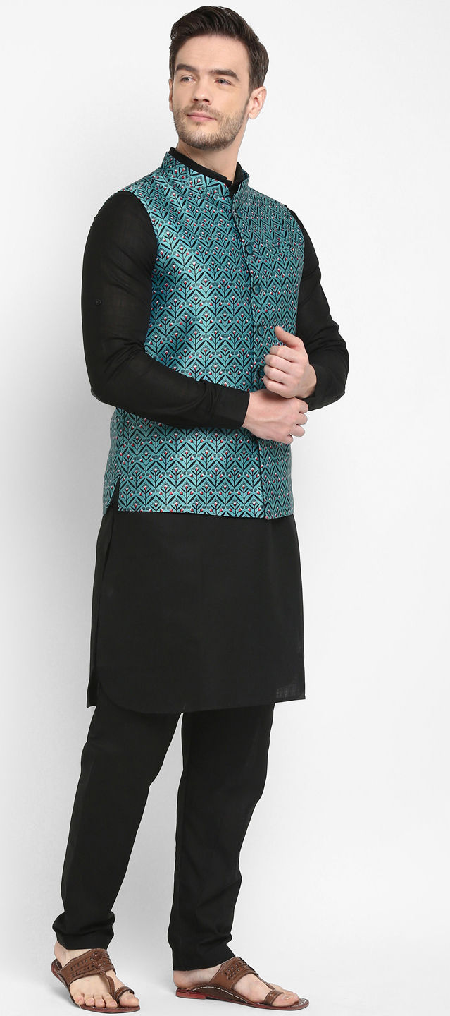 Black and Grey color Kurta Pyjama with Jacket in Cotton fabric with Printed work