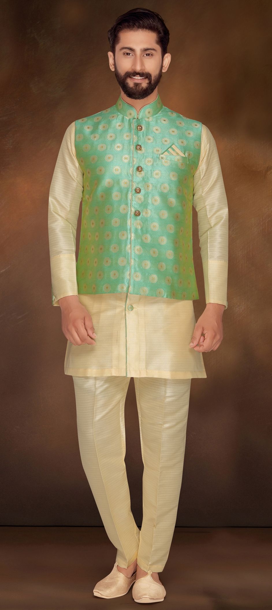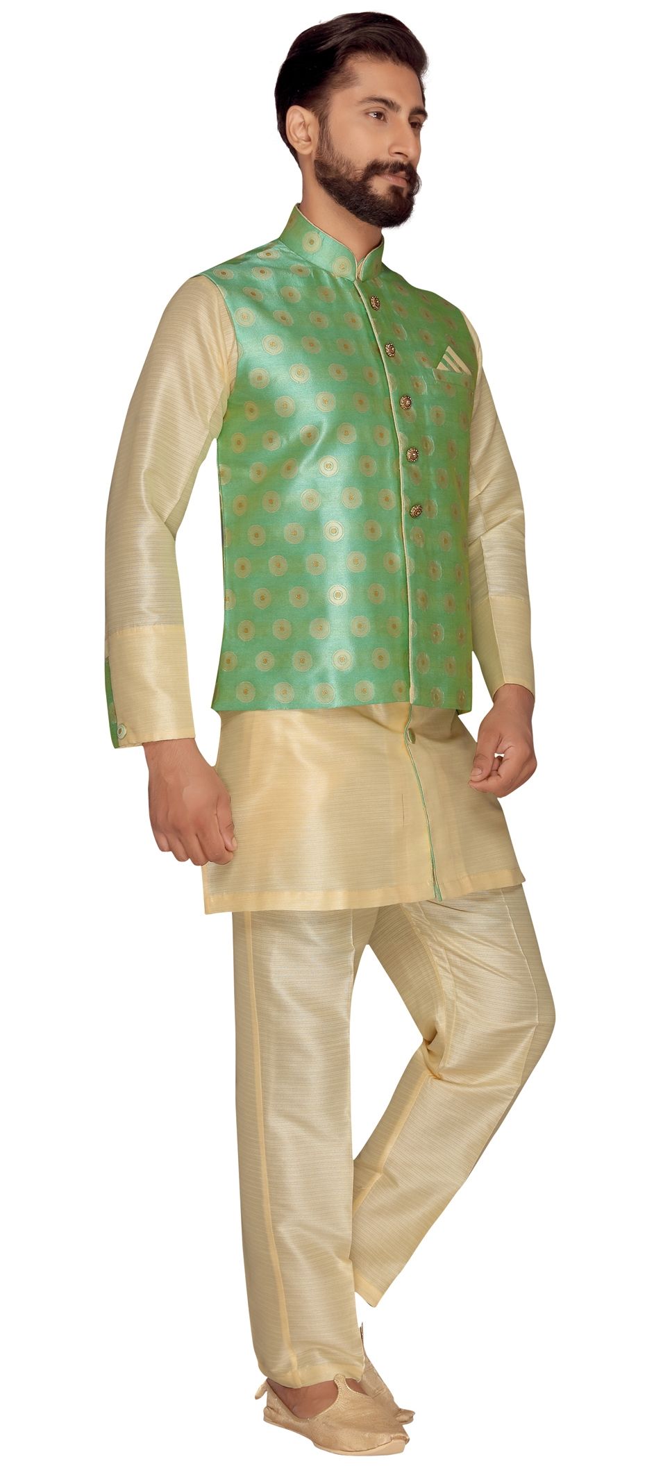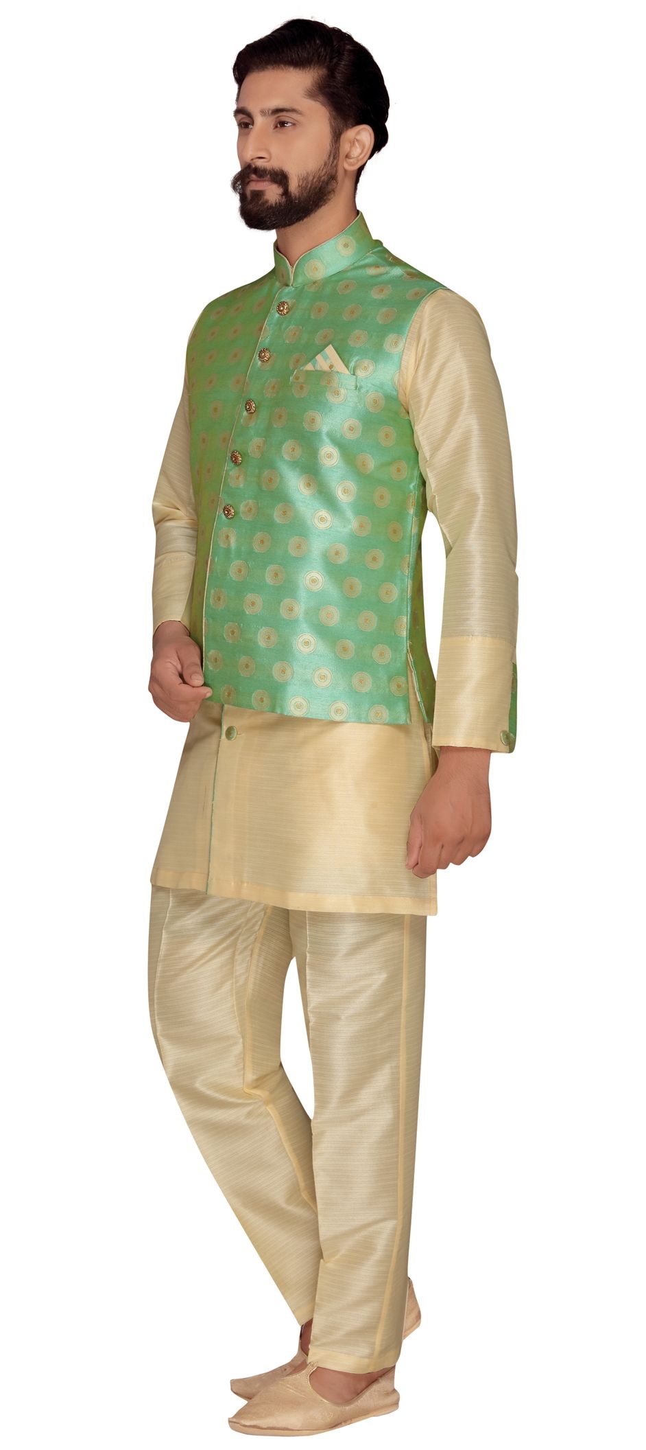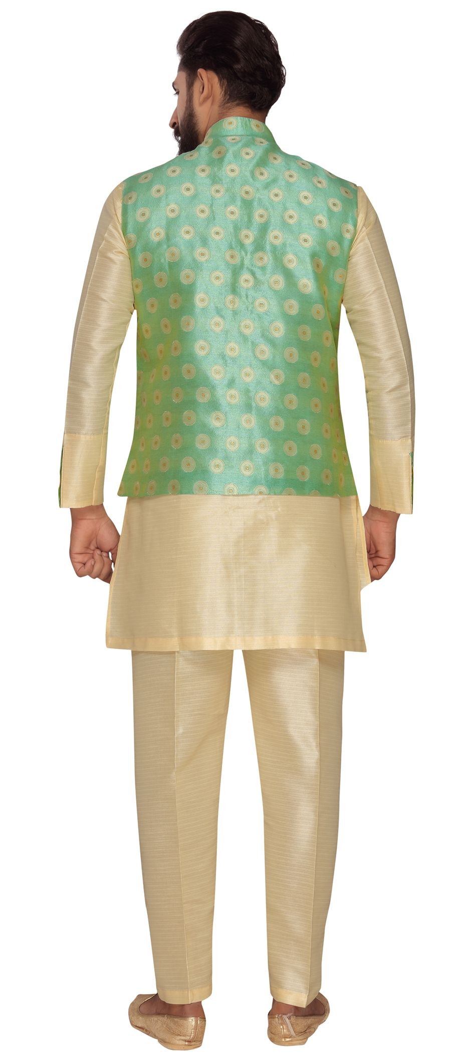 Beige and Brown color Kurta Pyjama with Jacket in Dupion Silk fabric with Broches work