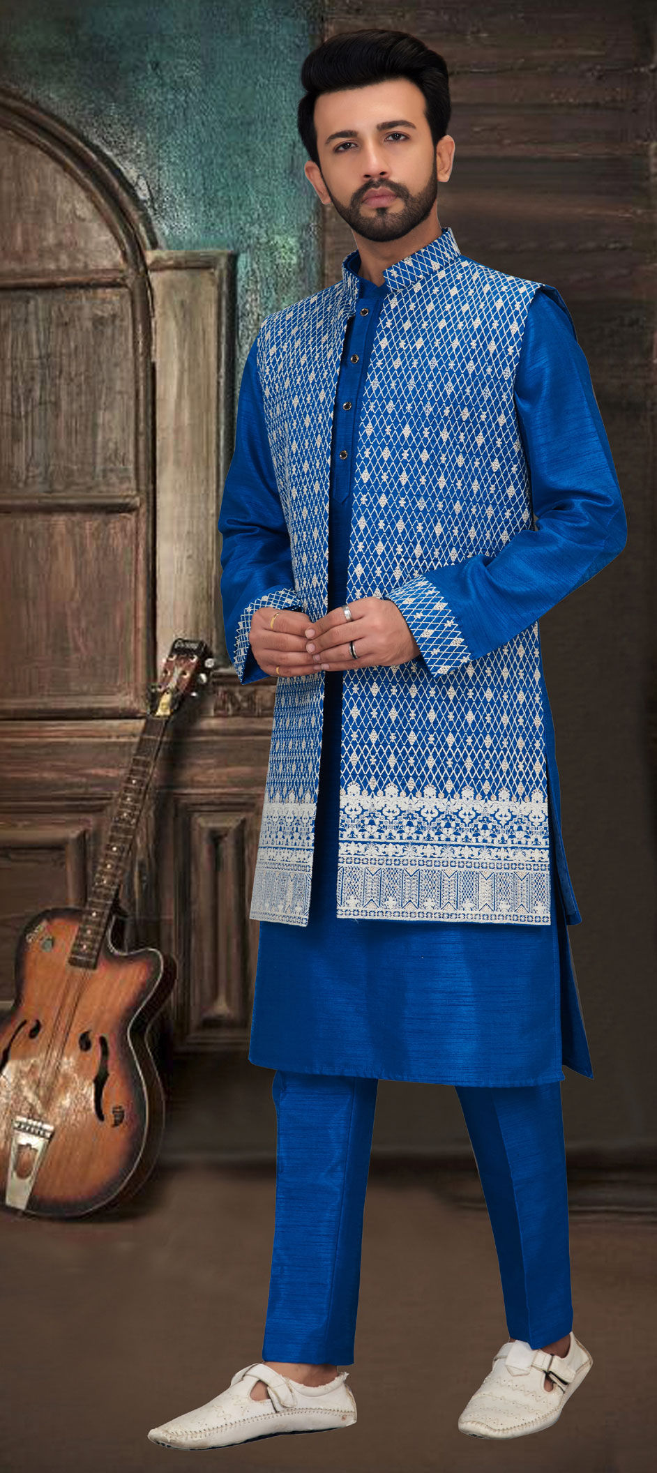 Blue color Kurta Pyjama with Jacket in Dupion Silk fabric with Embroidered, Sequence, Thread work