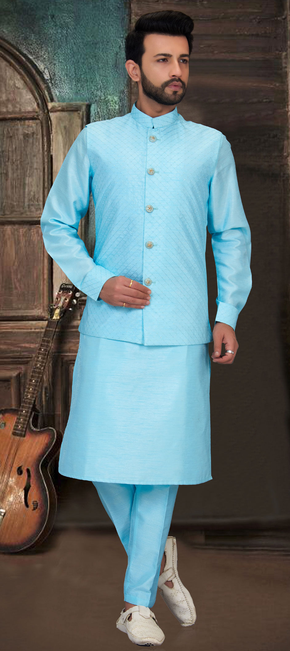 Blue color Kurta Pyjama with Jacket in Dupion Silk fabric with Sequence, Thread work