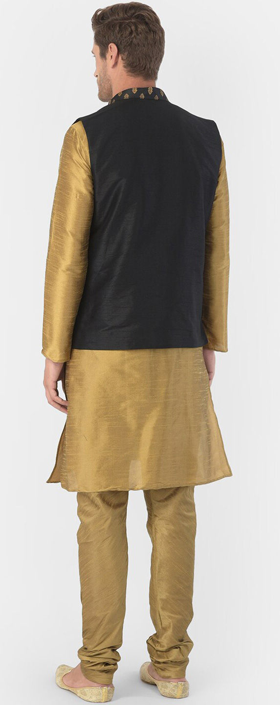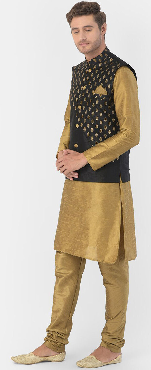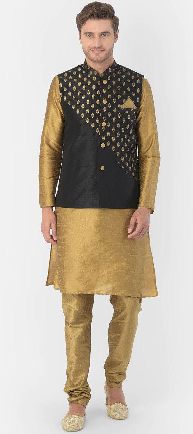 Gold color Kurta Pyjama with Jacket in Dupion Silk fabric with Printed work