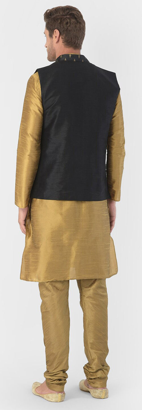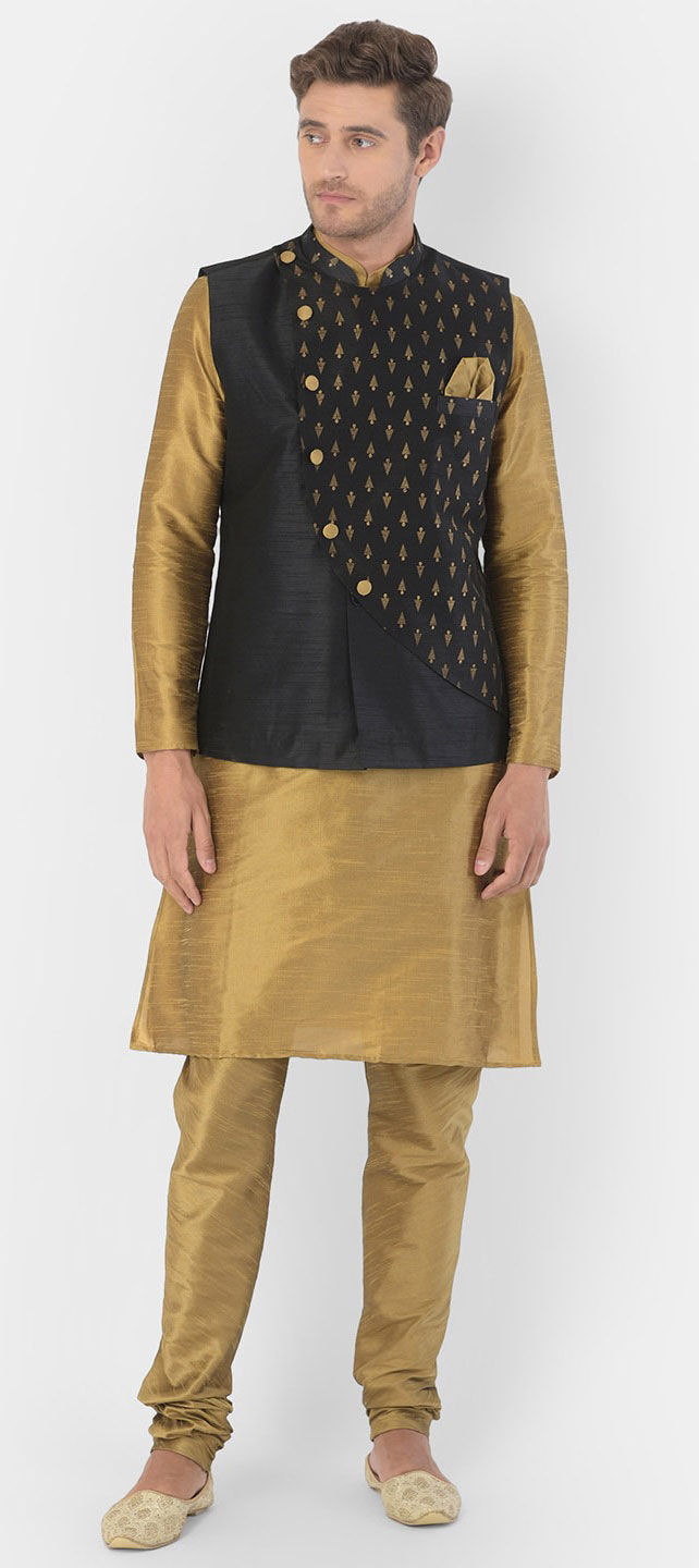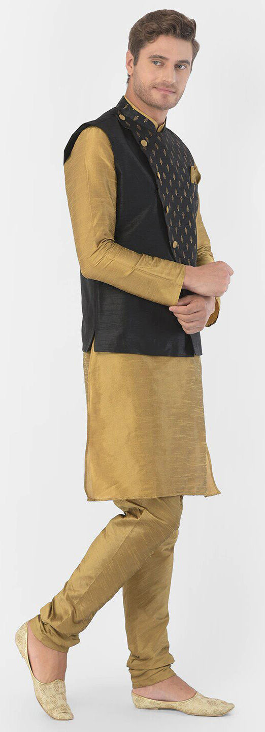 Gold color Kurta Pyjama with Jacket in Dupion Silk fabric with Printed work