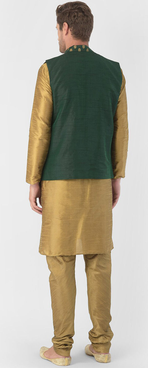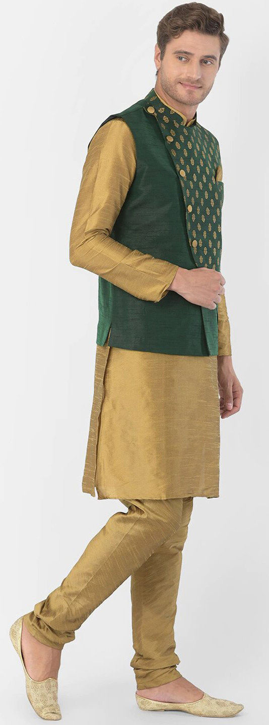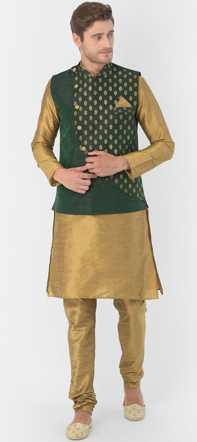 Gold color Kurta Pyjama with Jacket in Dupion Silk fabric with Printed work