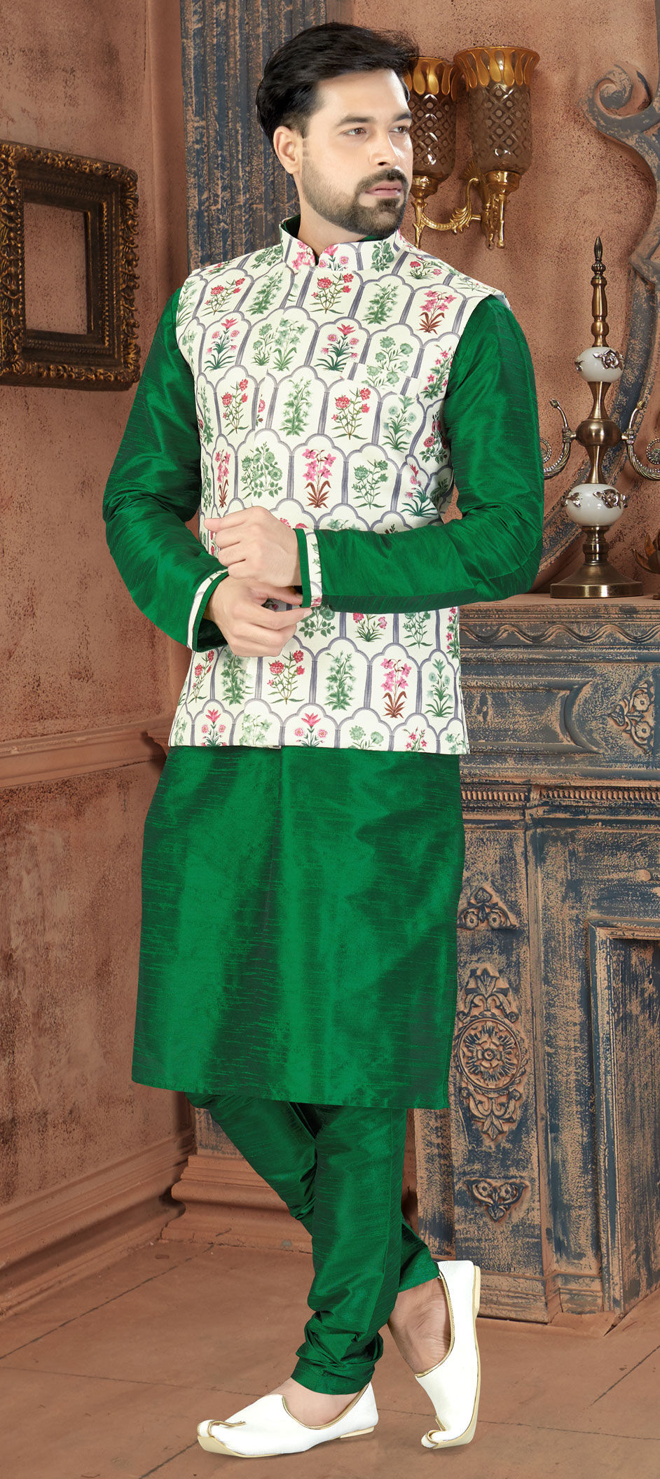 Green color Kurta Pyjama with Jacket in Dupion Silk fabric with Digital Print work