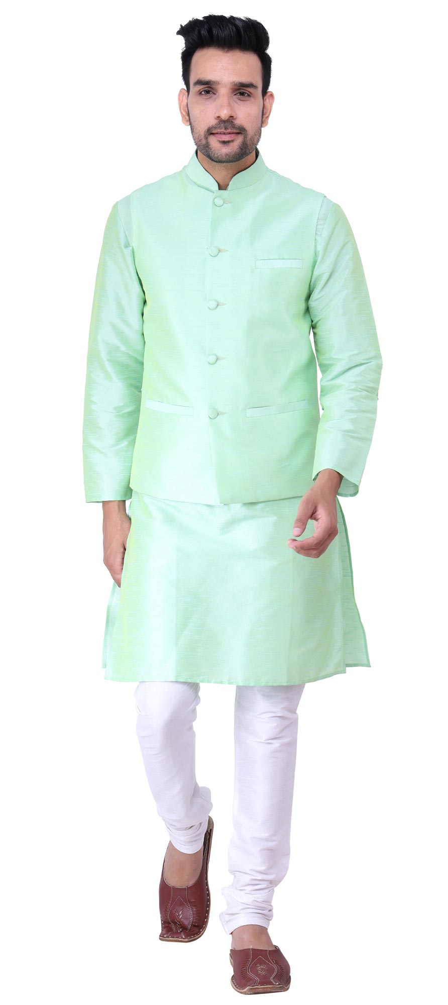 Green color Kurta Pyjama with Jacket in Dupion Silk fabric with Thread work