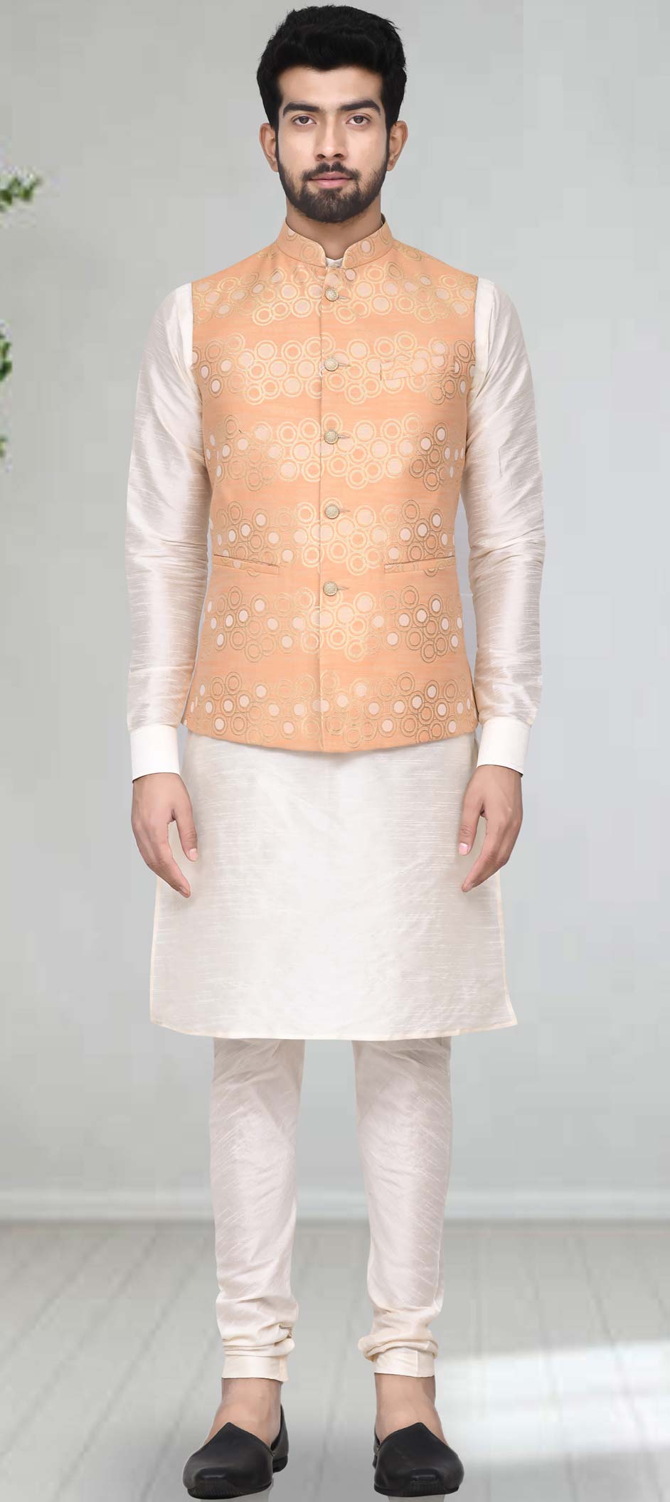 White and Off White color Kurta Pyjama with Jacket in Dupion Silk fabric with Thread work