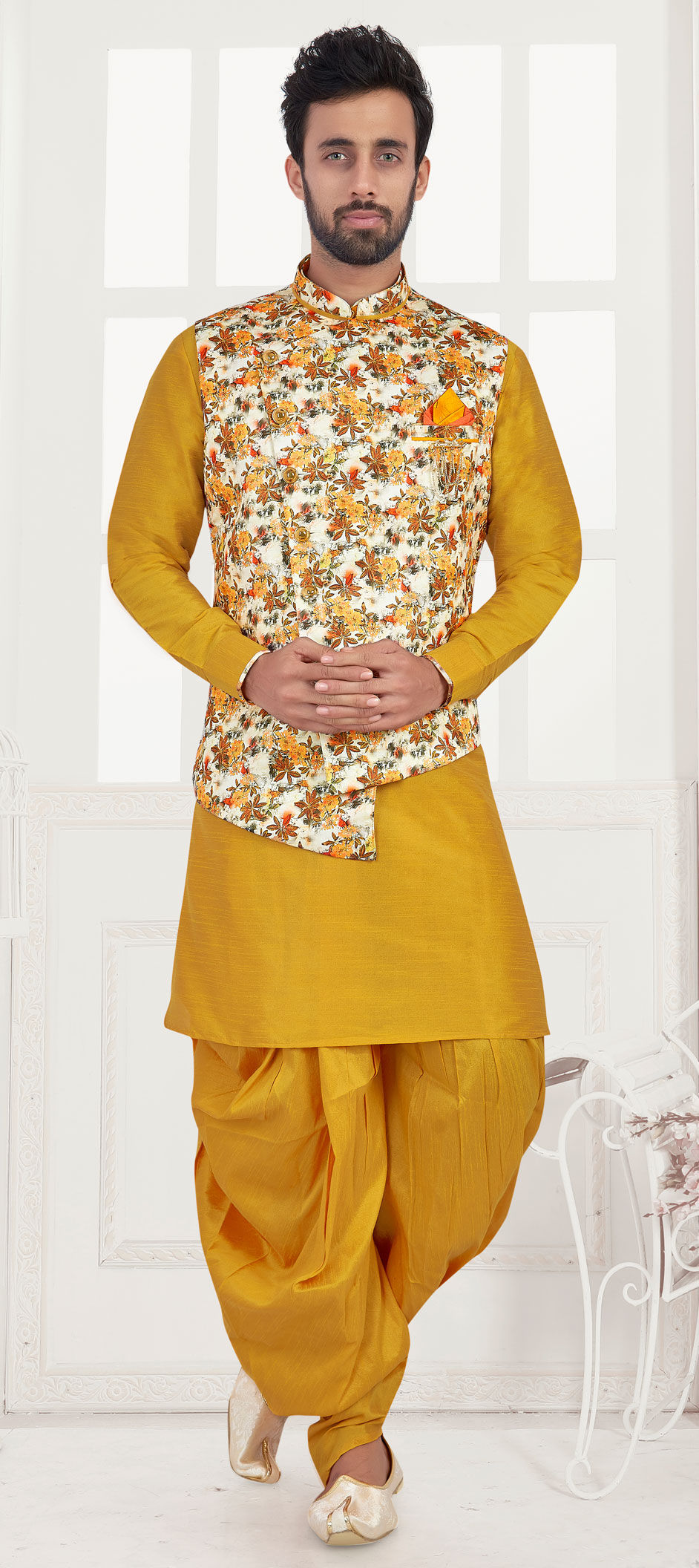 Yellow color Kurta Pyjama with Jacket in Dupion Silk fabric with Thread work