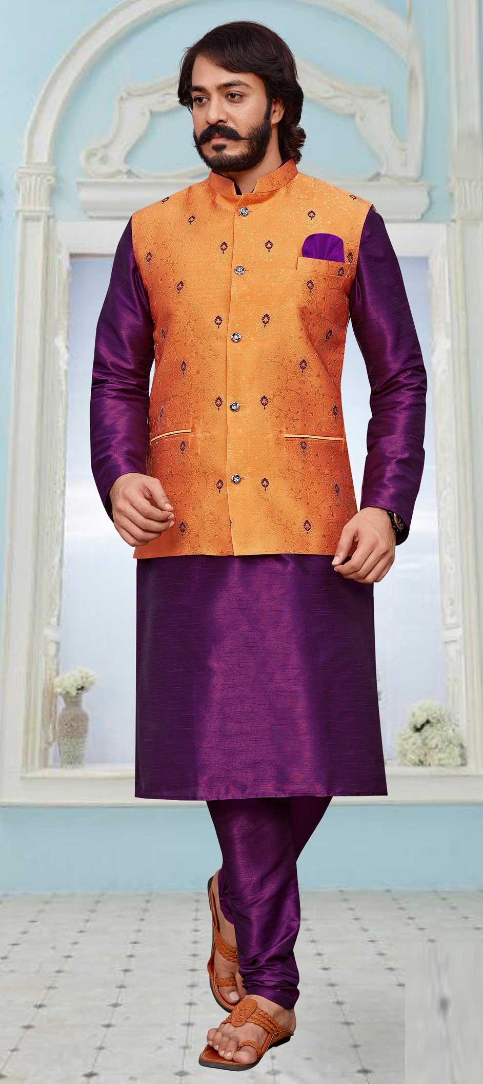 Purple and Violet color Kurta Pyjama with Jacket in Art Silk, Jacquard fabric with Weaving work