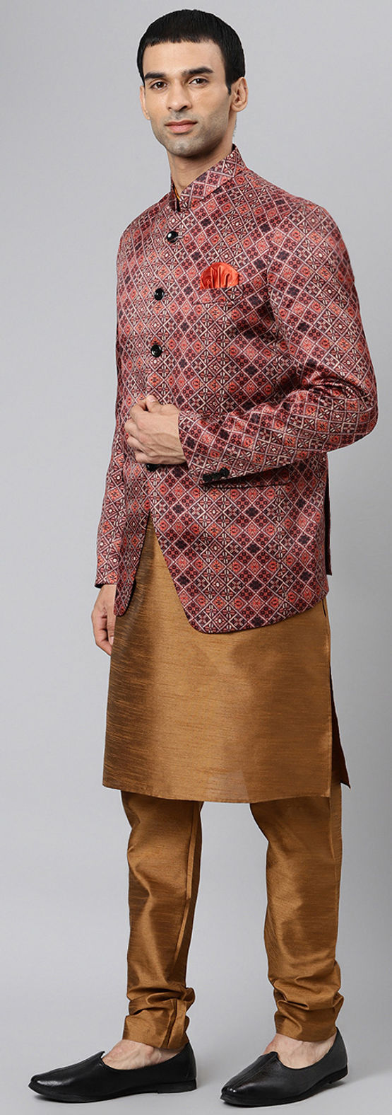 Beige and Brown color Kurta Pyjama with Jacket in Polyester Silk fabric with Printed work