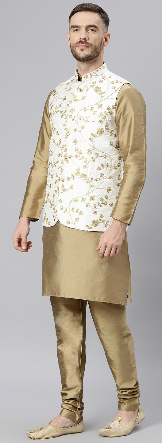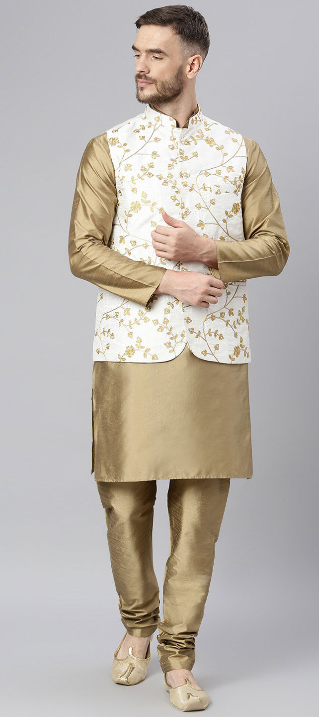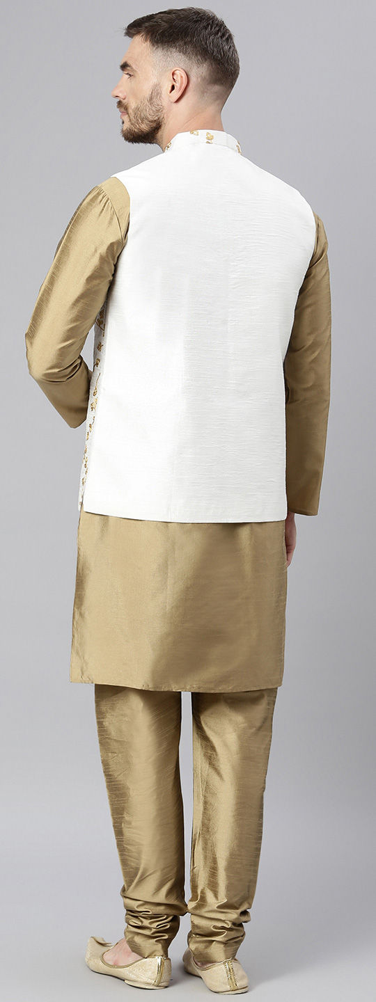Beige and Brown color Kurta Pyjama with Jacket in Polyester Silk fabric with Embroidered, Resham, Thread work