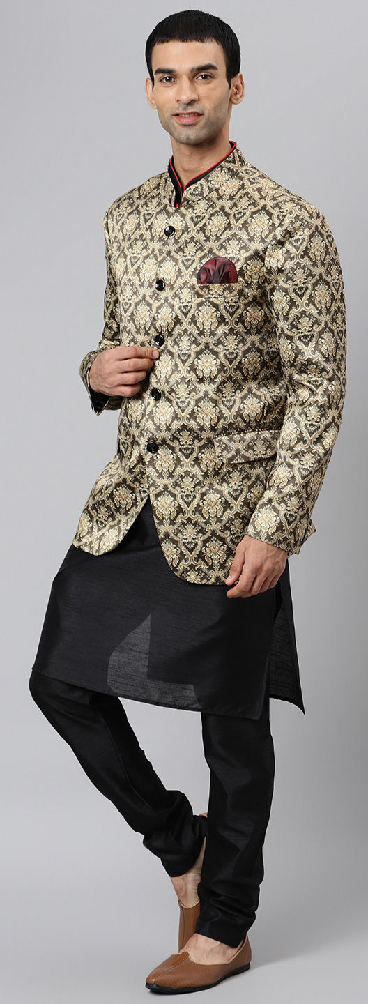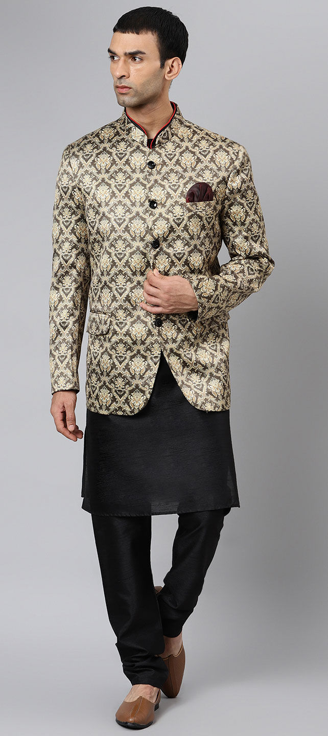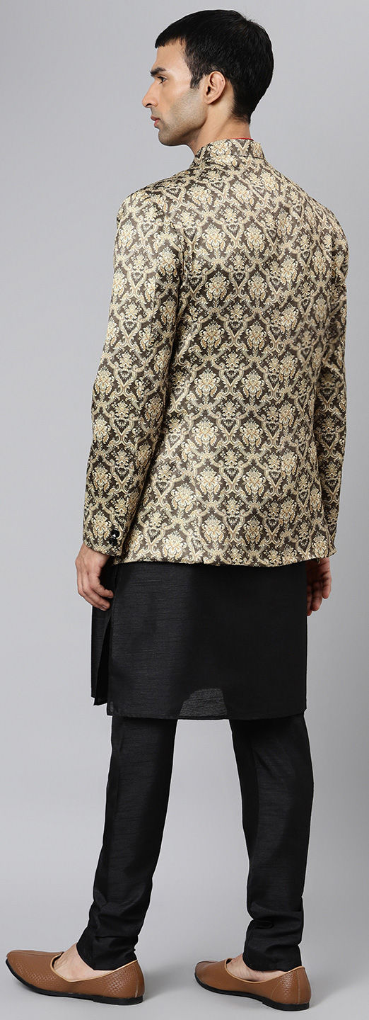 Black and Grey color Kurta Pyjama with Jacket in Polyester Silk fabric with Printed work
