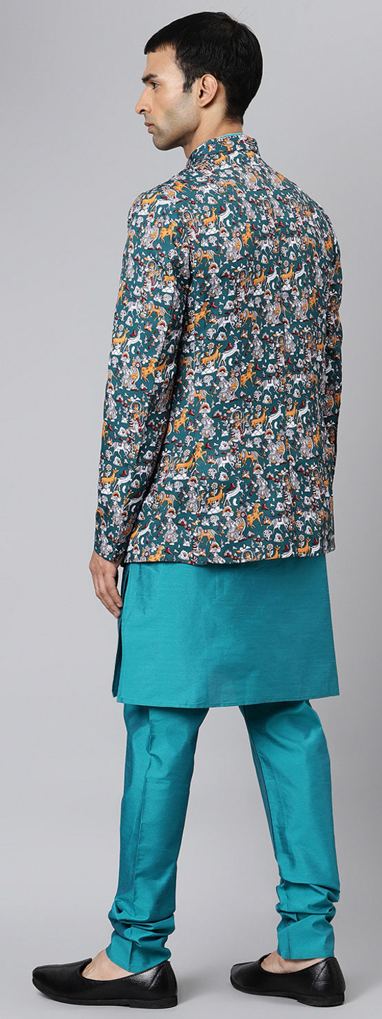 Blue color Kurta Pyjama with Jacket in Polyester Silk fabric with Printed work