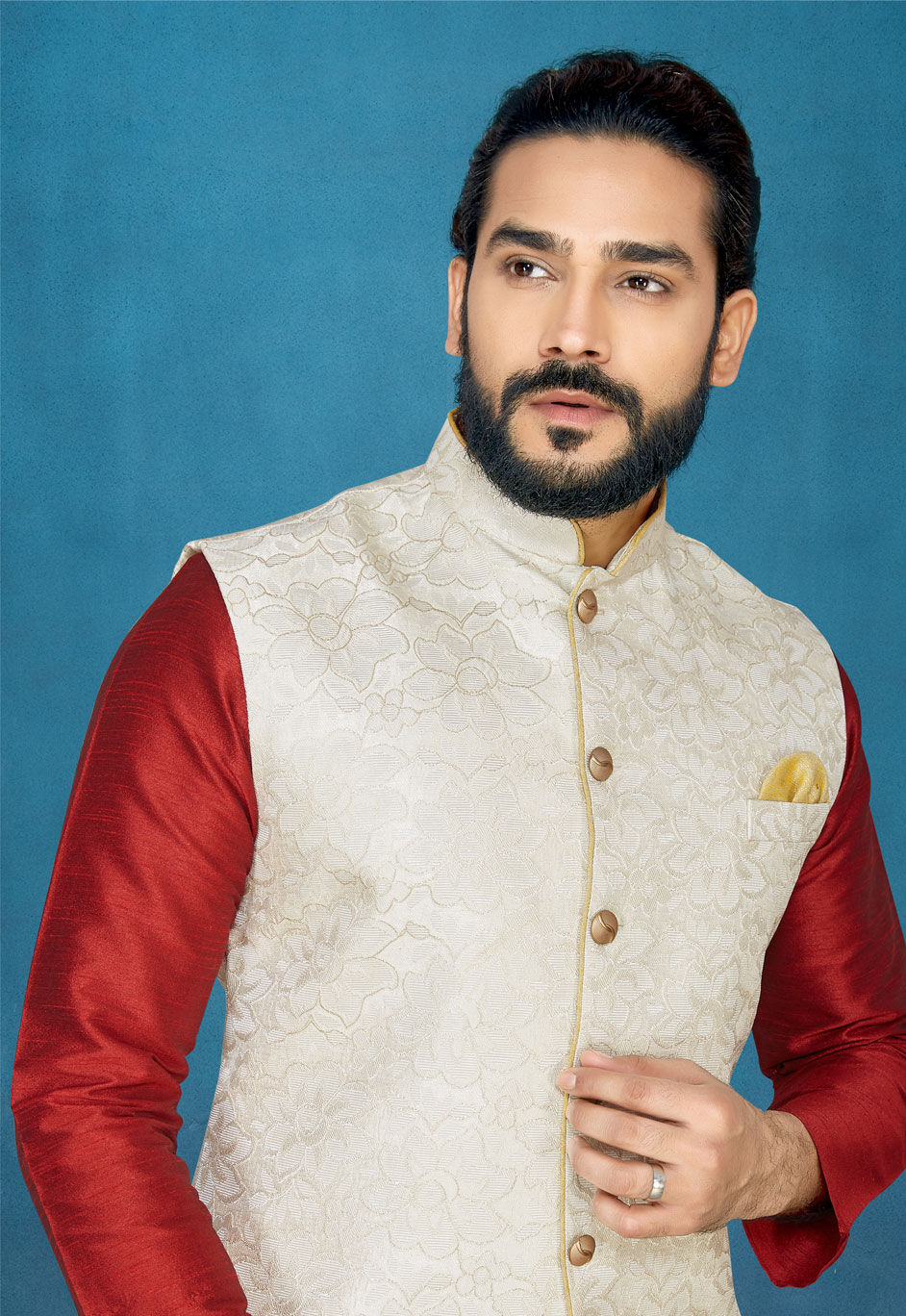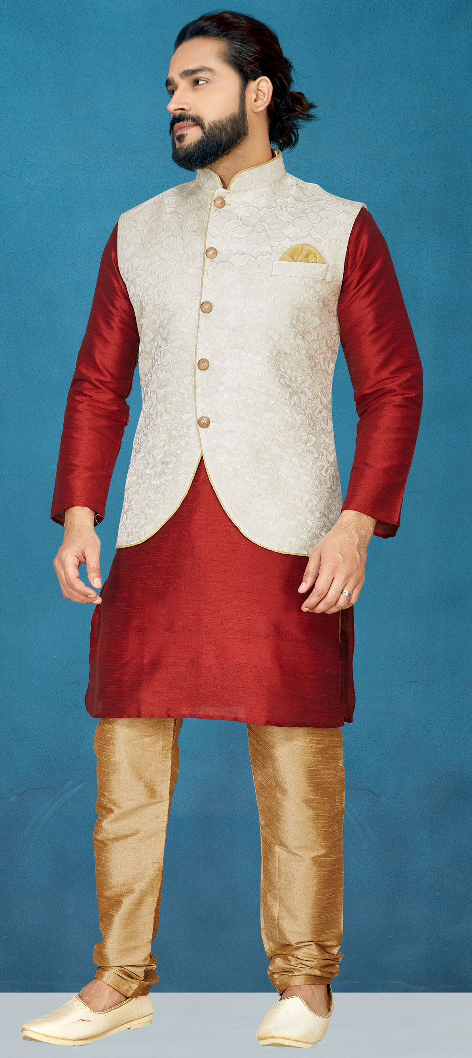 Red and Maroon color Kurta Pyjama with Jacket in Raw Silk fabric with Weaving work