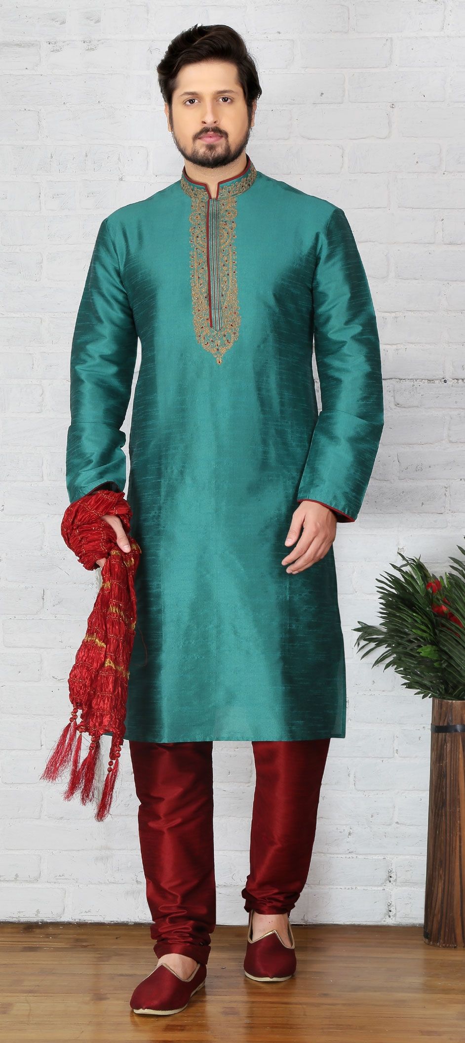 Blue color Kurta Pyjamas in Art Dupion Silk fabric with Embroidered, Thread work