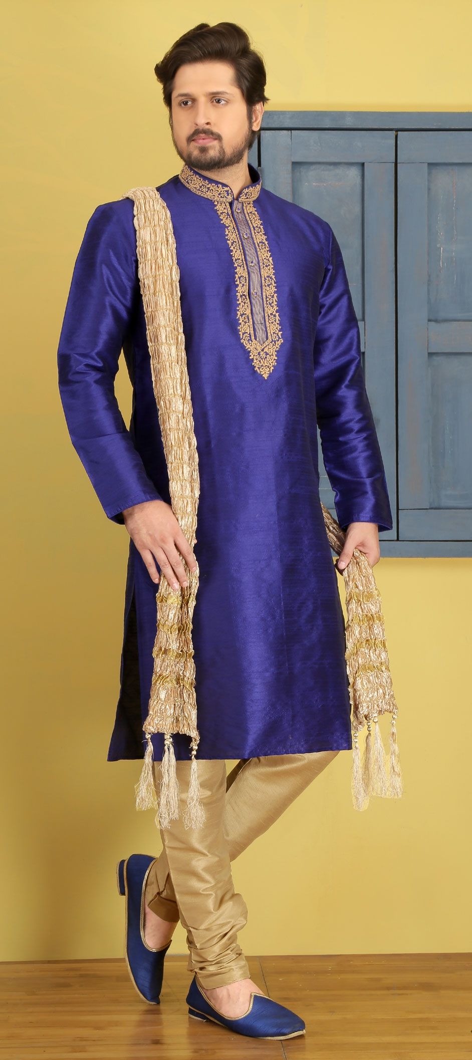 Blue color Kurta Pyjamas in Art Dupion Silk fabric with Embroidered, Thread work