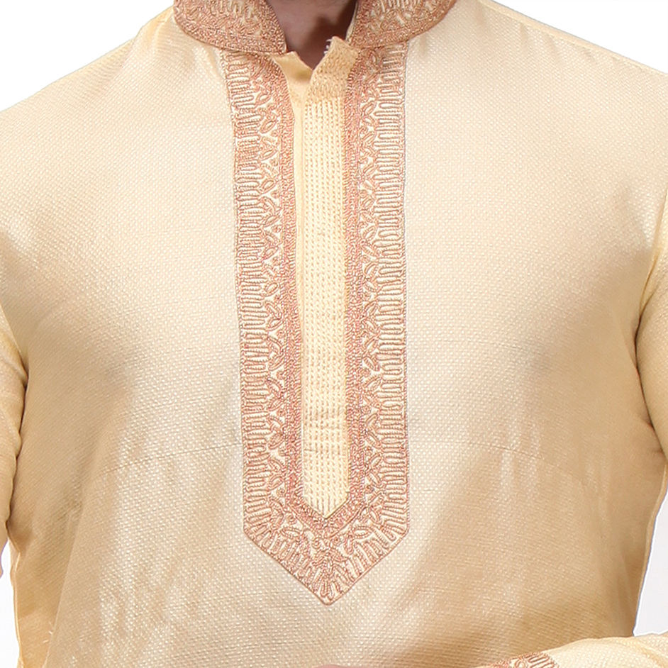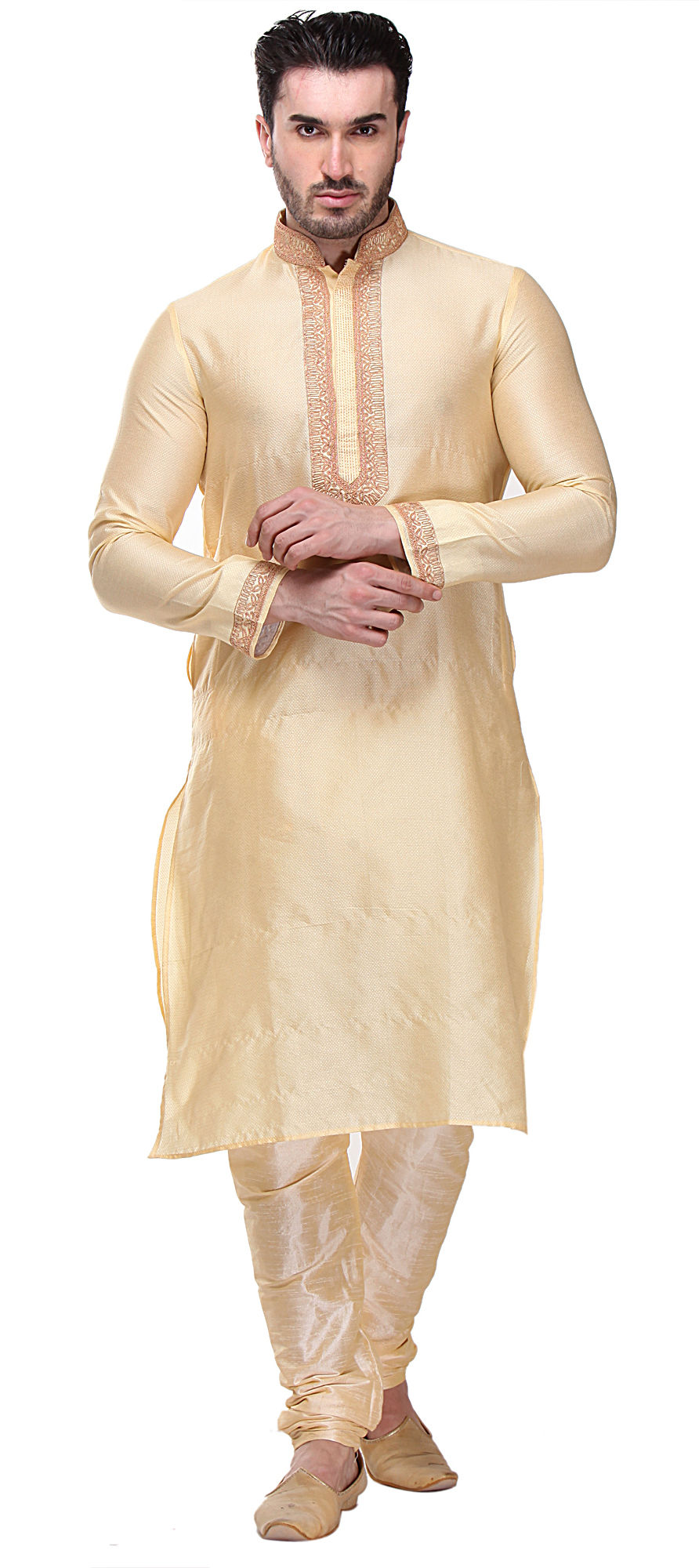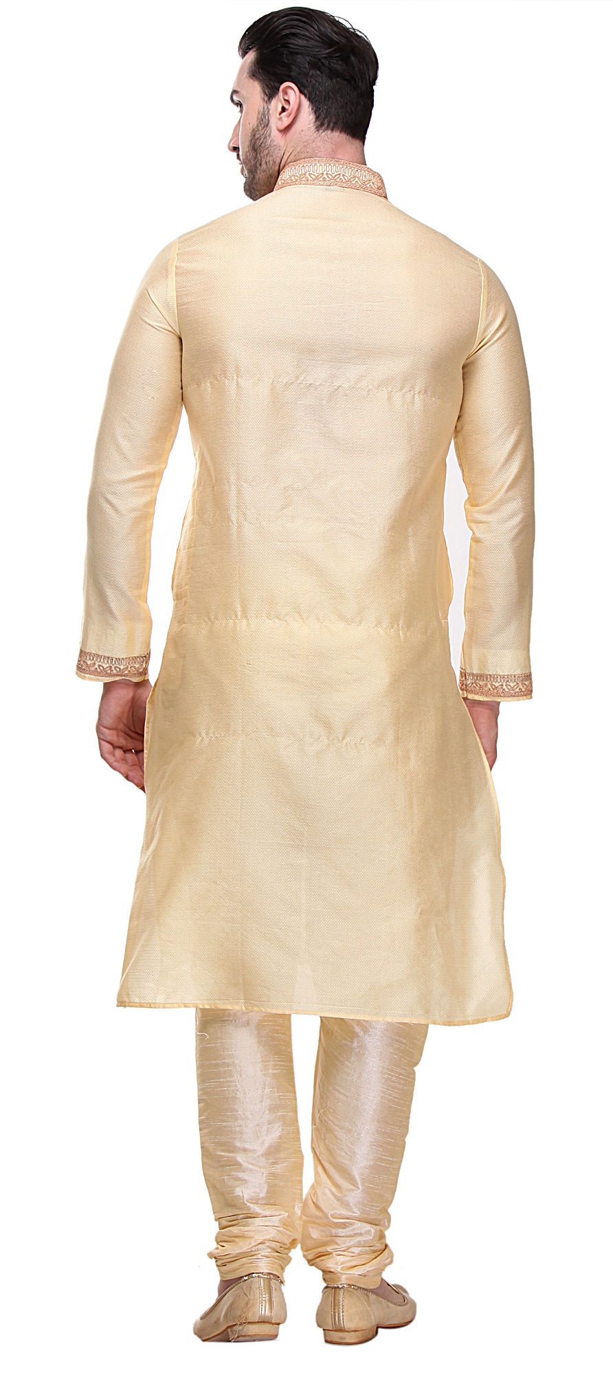 Gold color Kurta Pyjamas in Art Dupion Silk fabric with Embroidered, Thread work