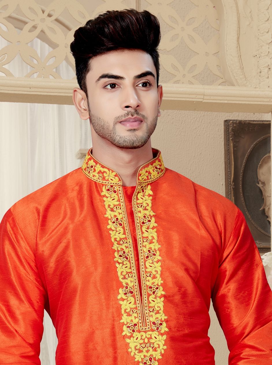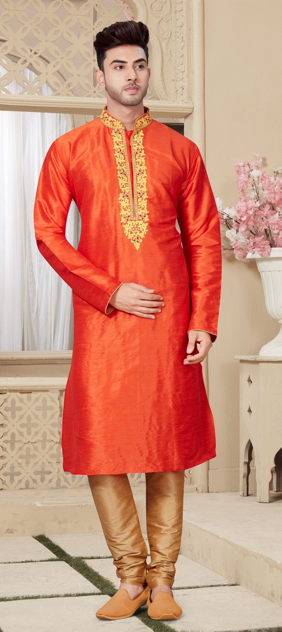 Orange color Kurta Pyjamas in Art Dupion Silk fabric with Embroidered, Resham, Stone, Thread work