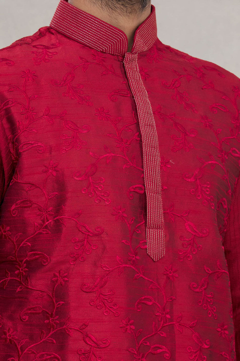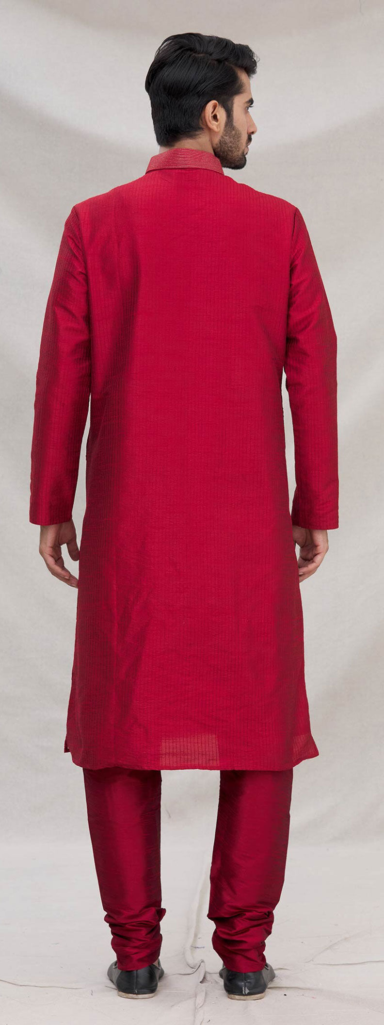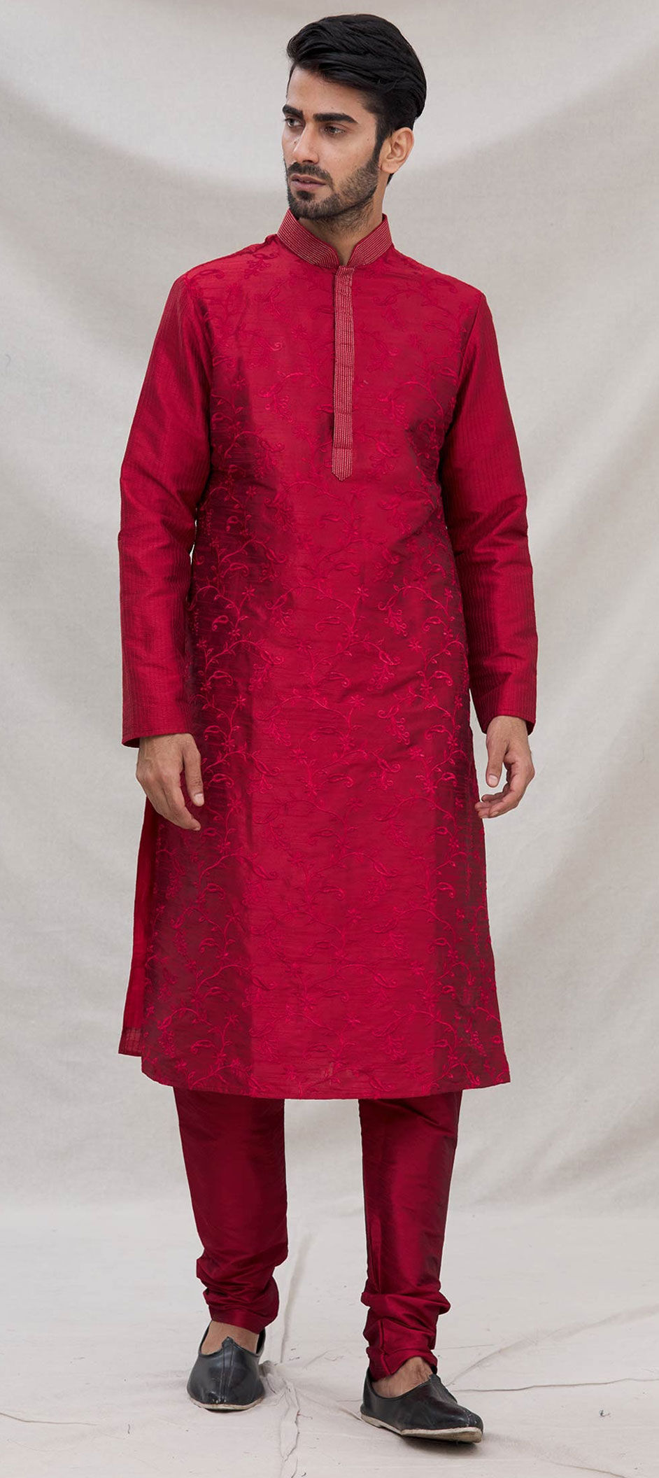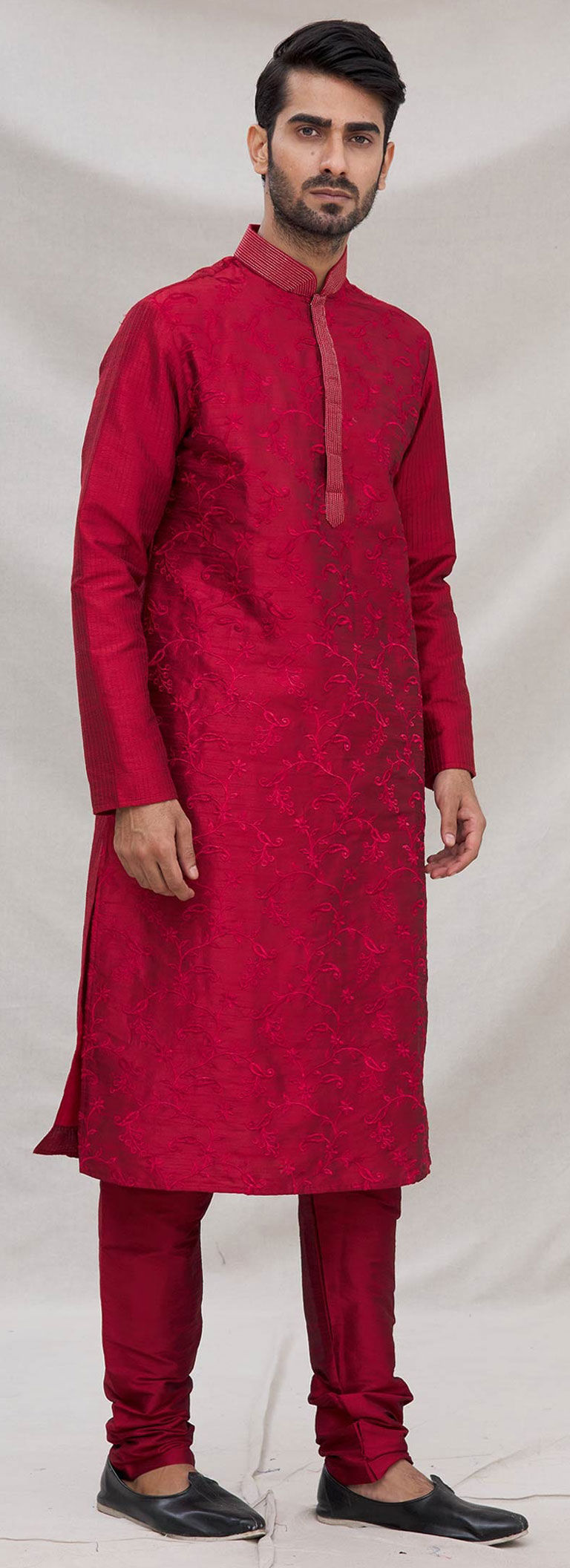 Red and Maroon color Kurta Pyjamas in Art Dupion Silk fabric with Thread work