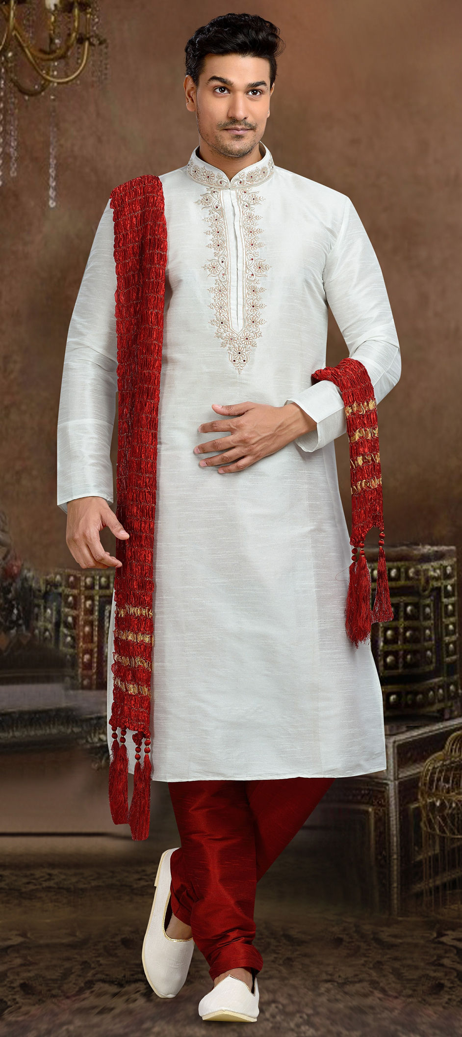 White and Off White color Kurta Pyjamas in Art Dupion Silk fabric with Stone, Thread work