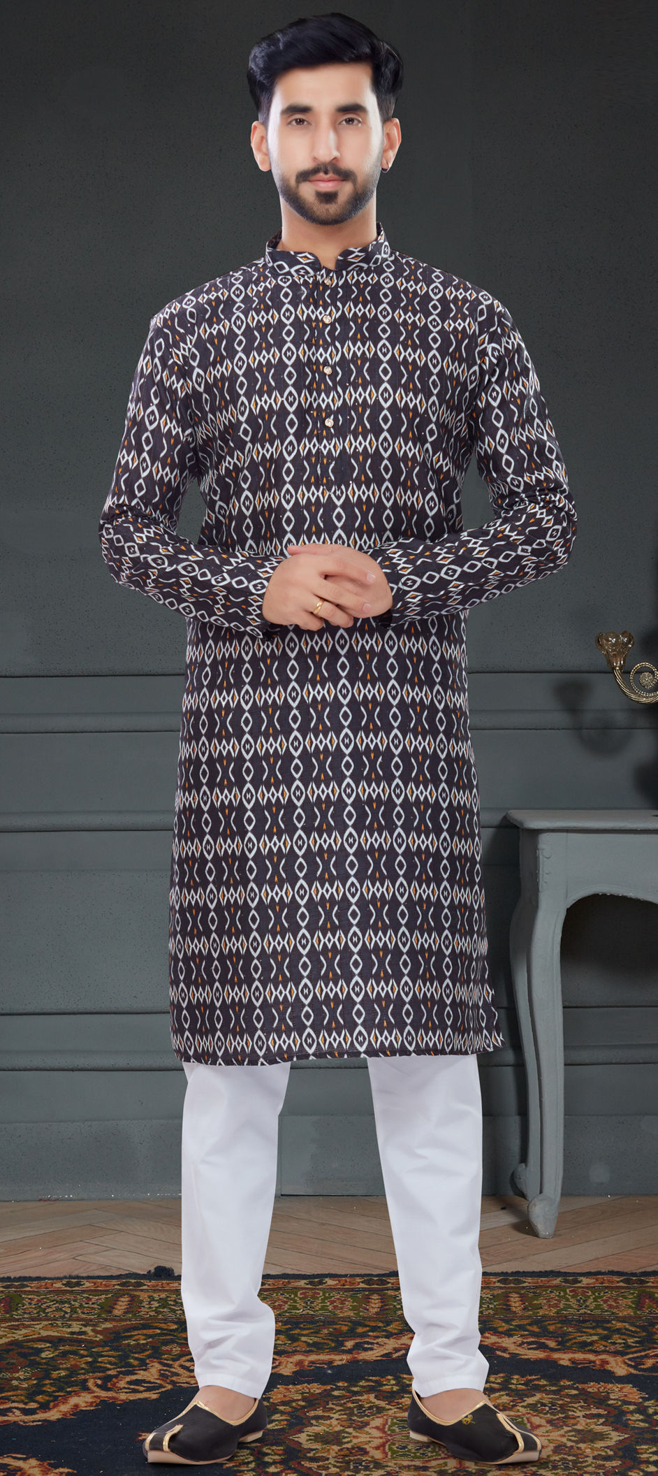 Black and Grey color Kurta Pyjamas in Art Silk fabric with Digital Print, Sequence, Thread work