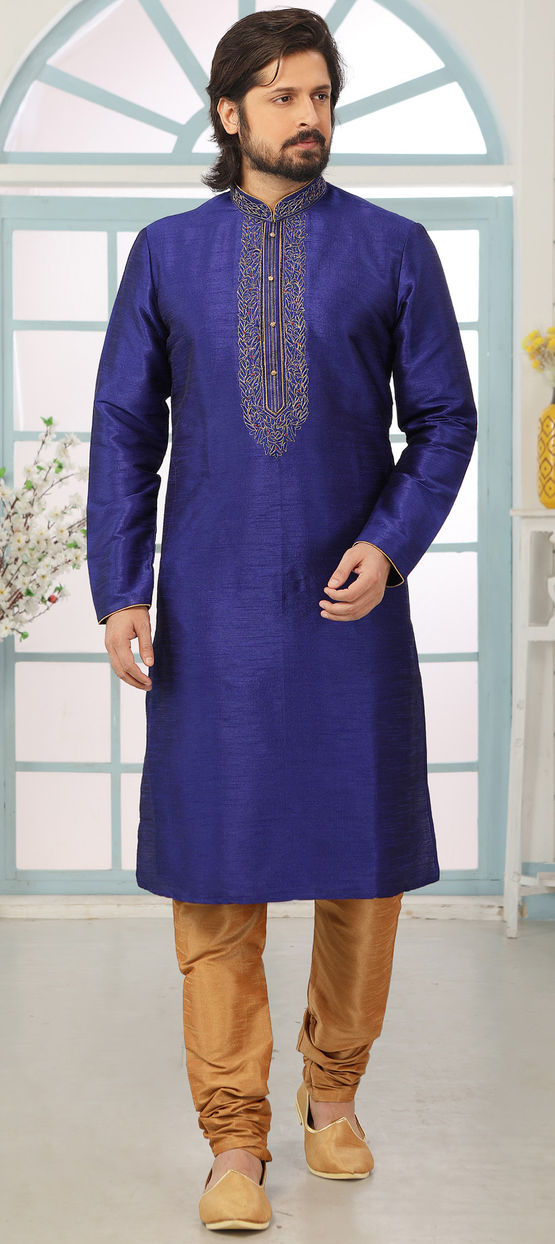 Blue color Kurta Pyjamas in Art Silk fabric with Embroidered, Thread work