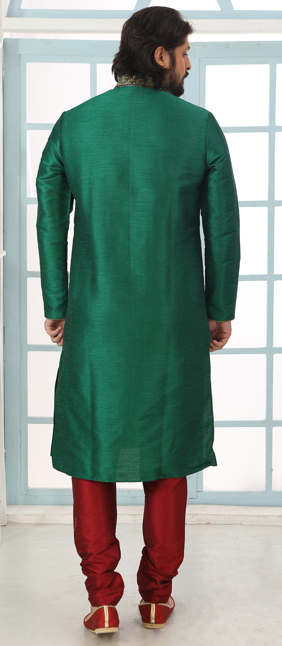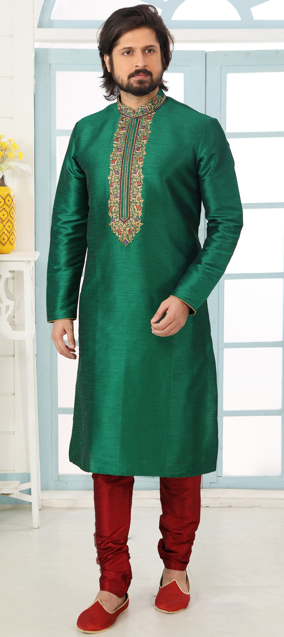 Art Silk Kurta Pyjamas in Green with Embroidered work