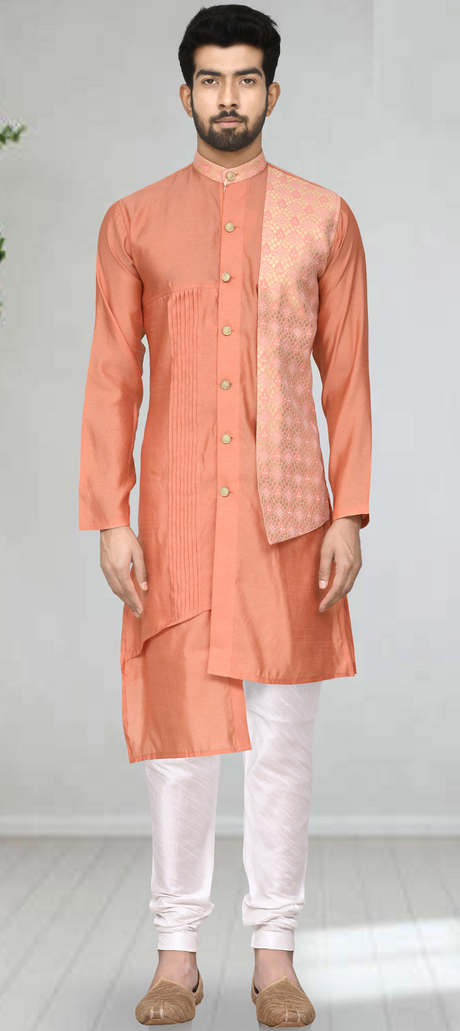 Orange color Kurta Pyjamas in Art Silk fabric with Pleats, Weaving work