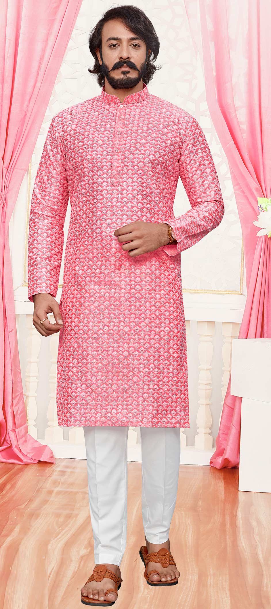 Pink and Majenta color Kurta Pyjamas in Art Silk fabric with Embroidered, Resham, Thread work