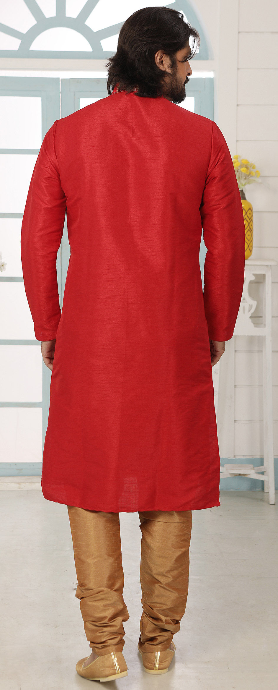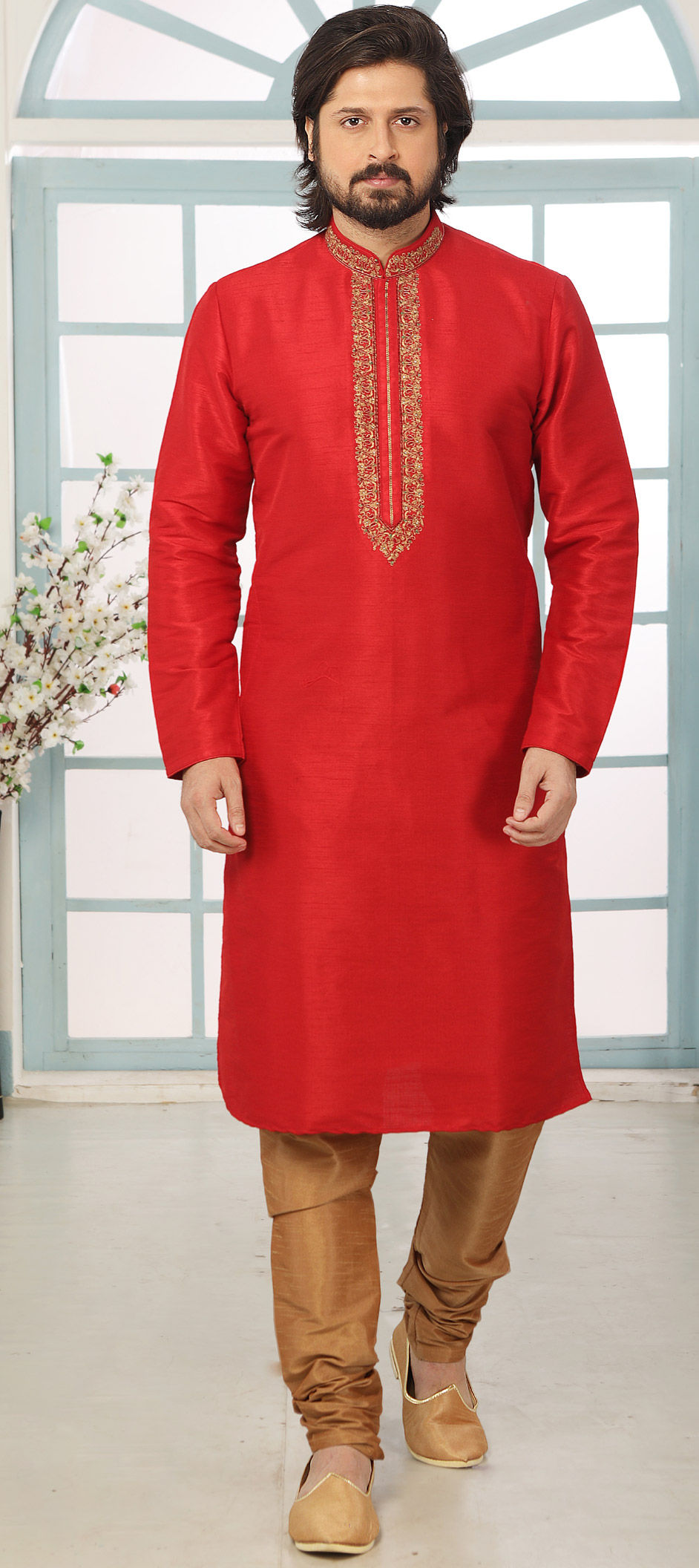 Red and Maroon color Kurta Pyjamas in Art Silk fabric with Embroidered, Thread work