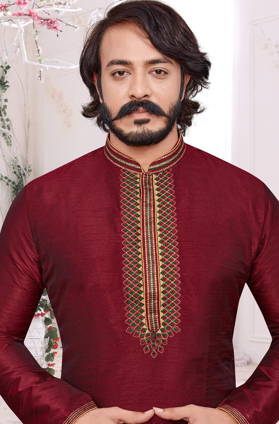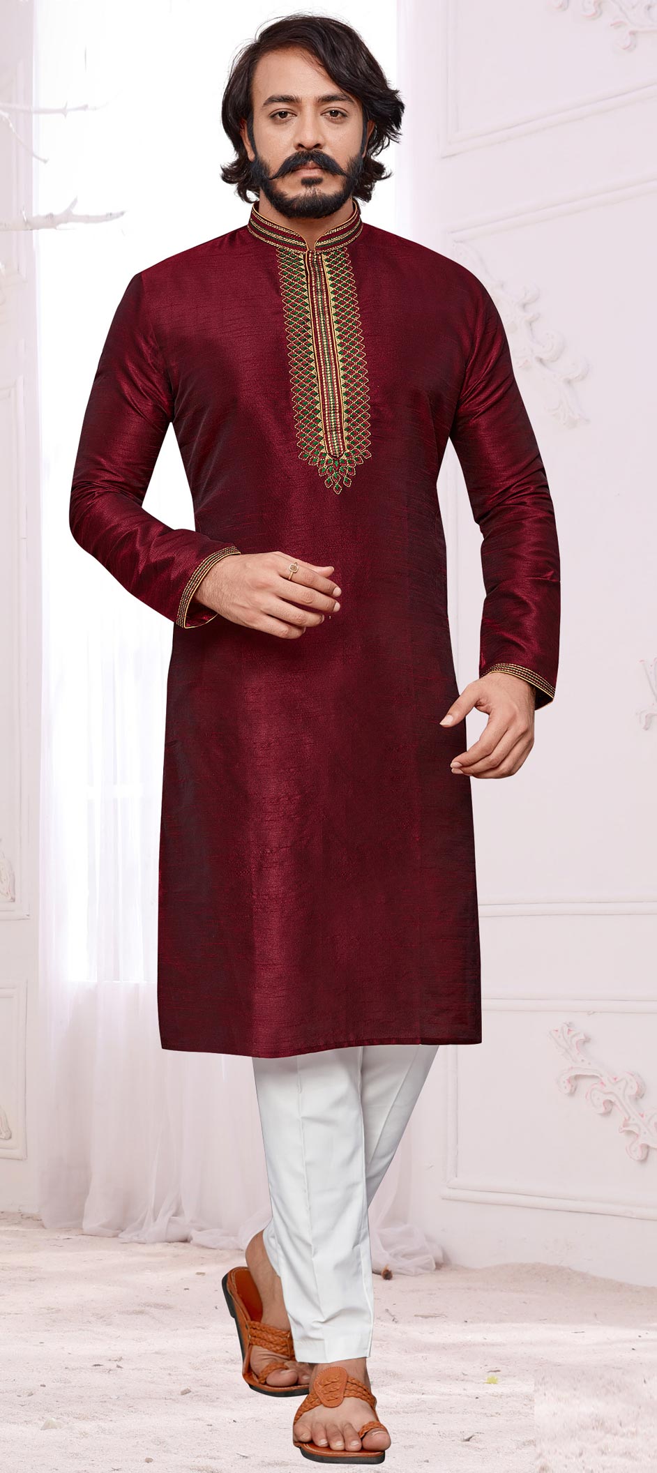 Red and Maroon color Kurta Pyjamas in Art Silk fabric with Embroidered, Thread work
