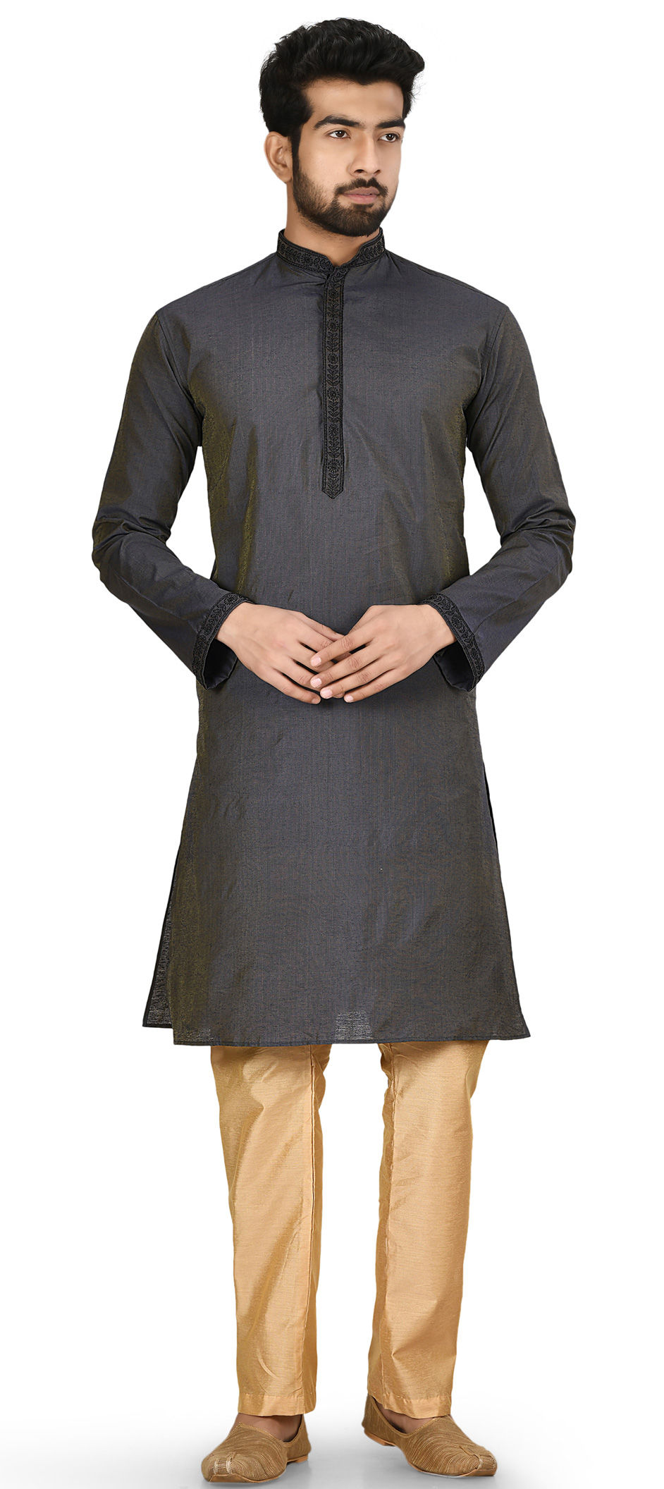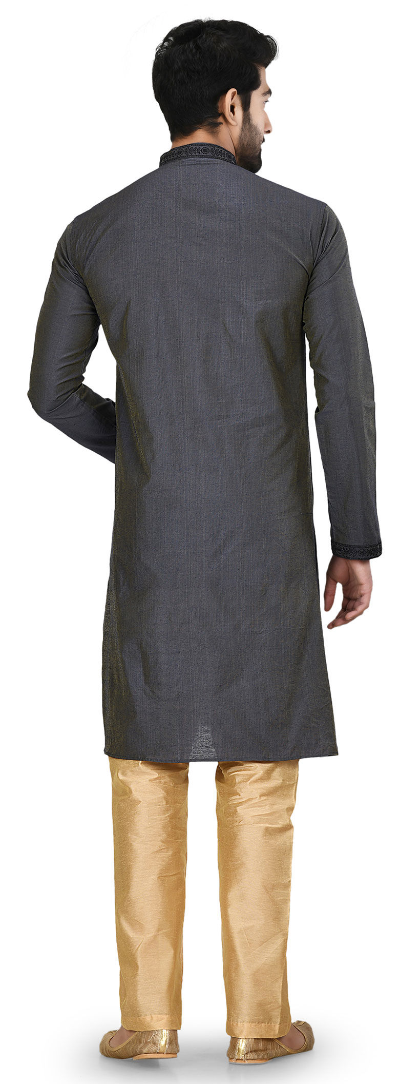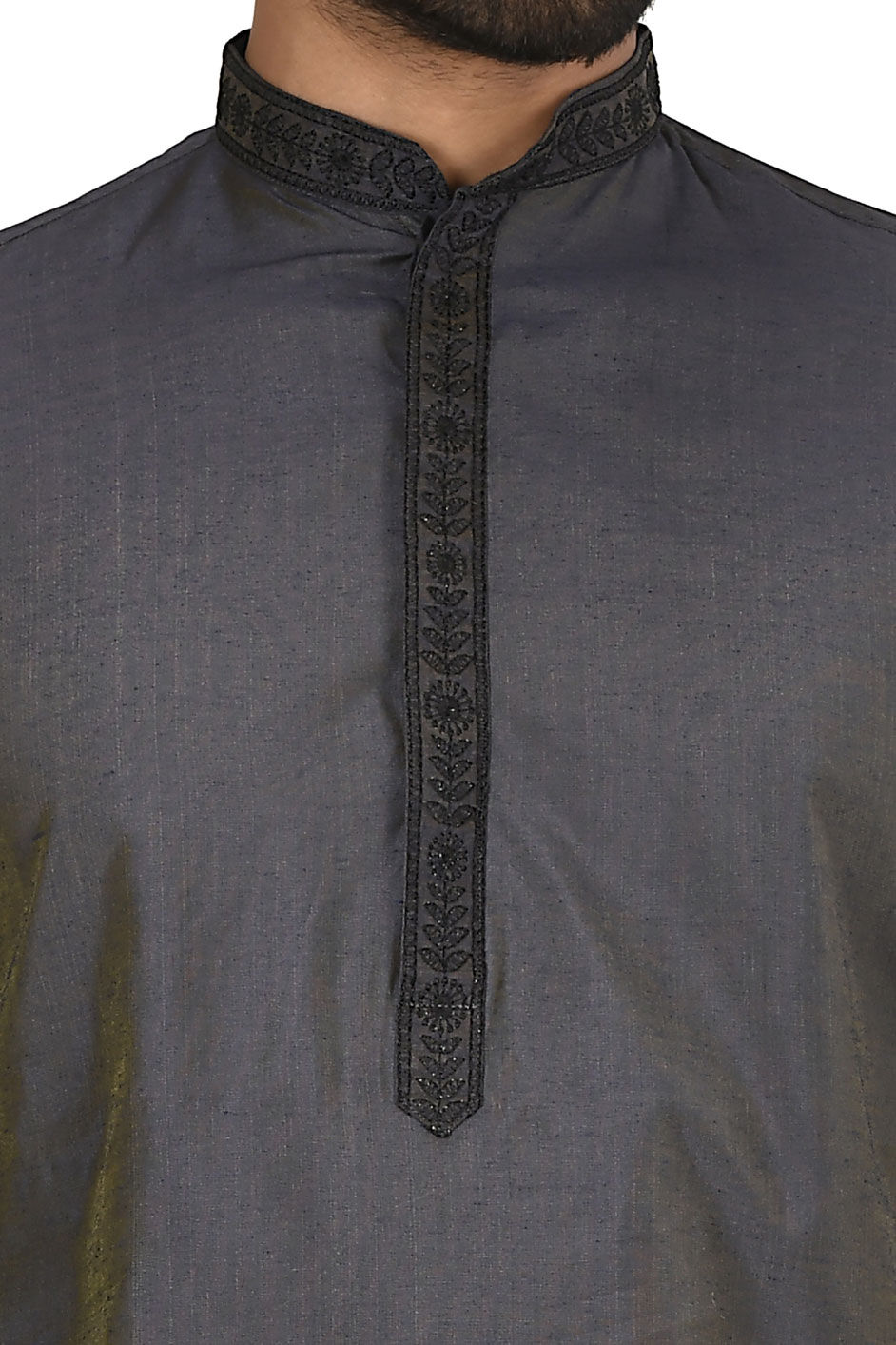 Blended Cotton Kurta Pyjamas in Black and Grey with Embroidered work