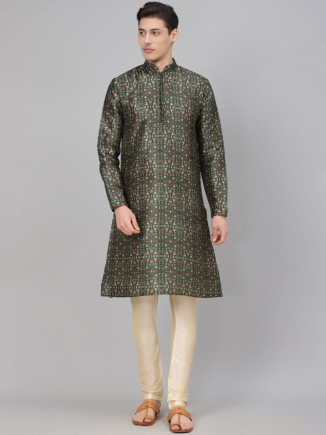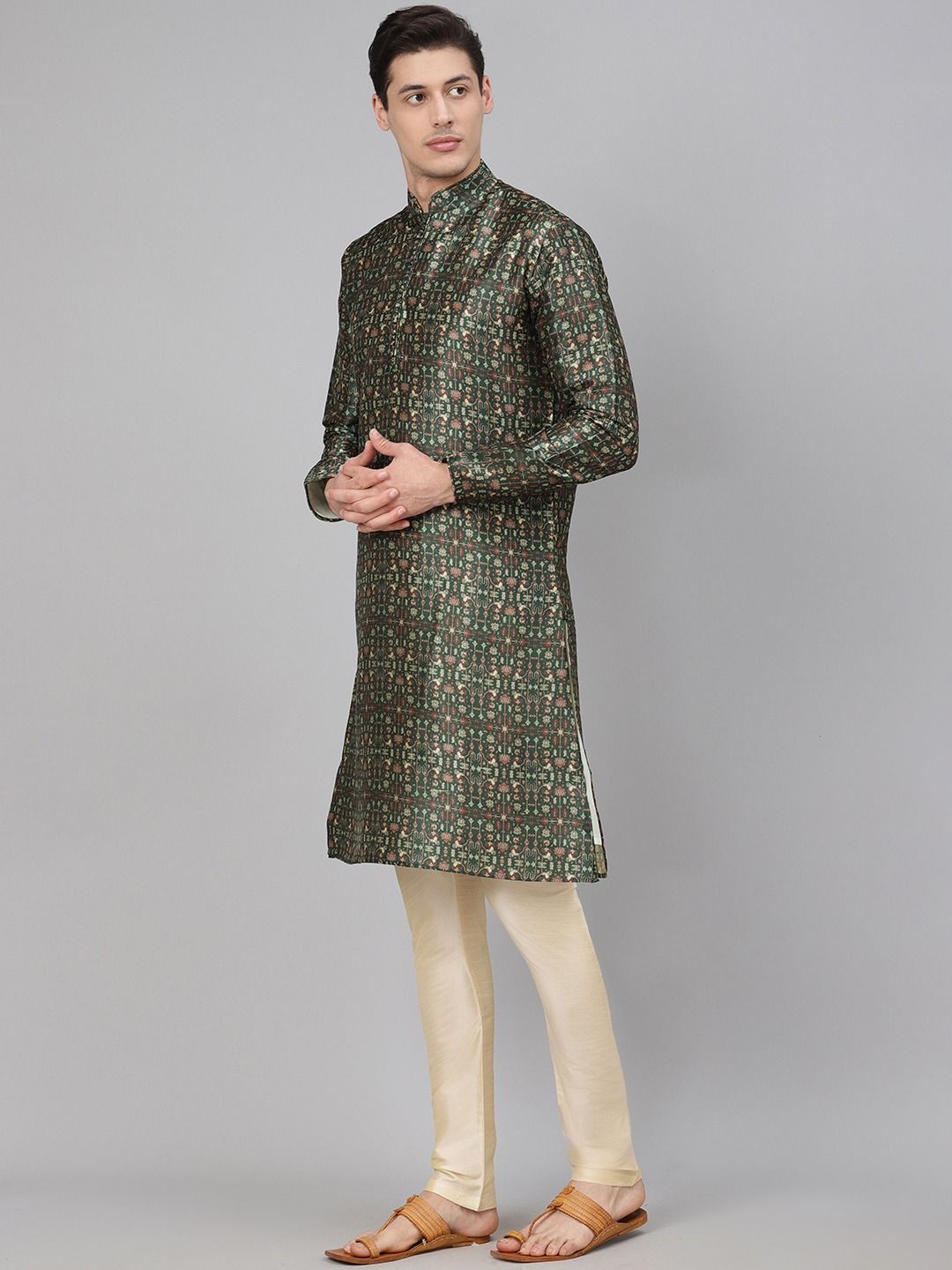 Beige and Brown, Green color Kurta Pyjamas in Blended fabric with Floral, Printed work