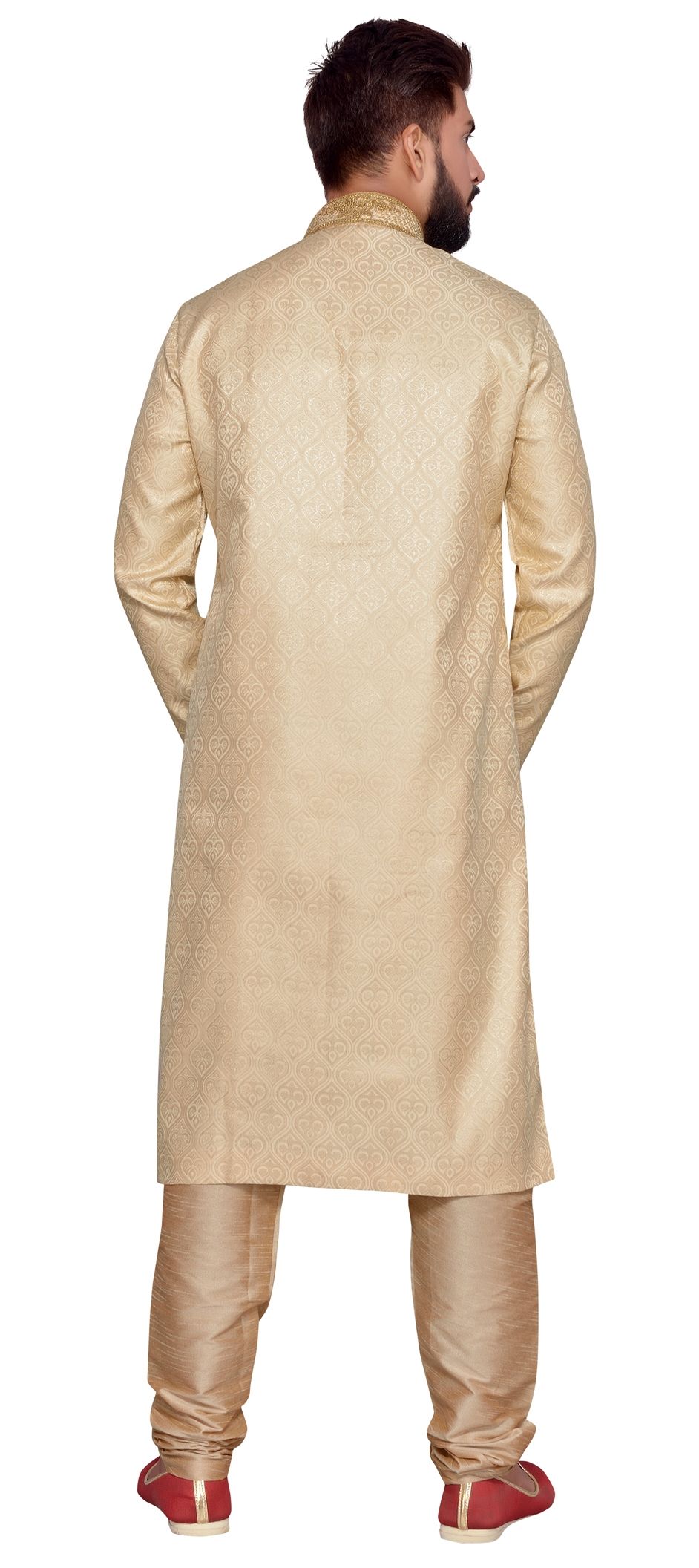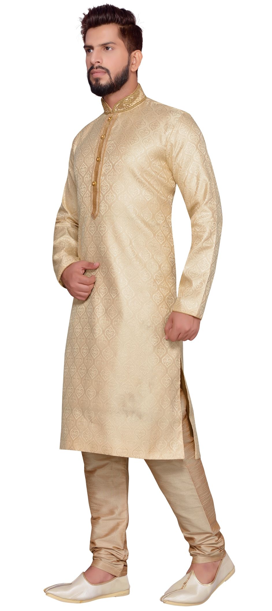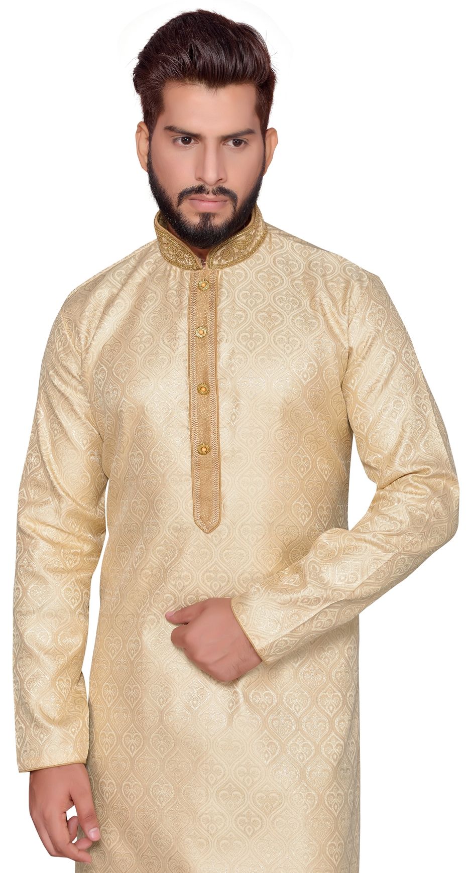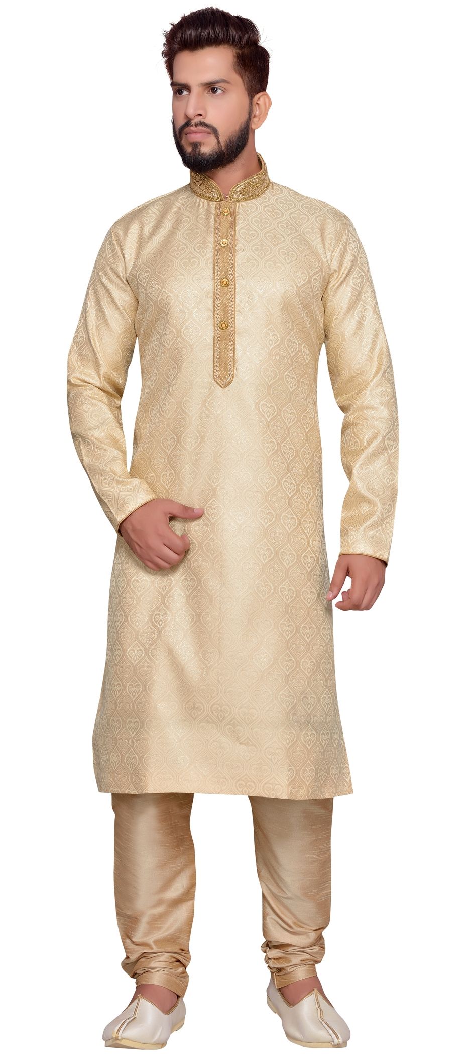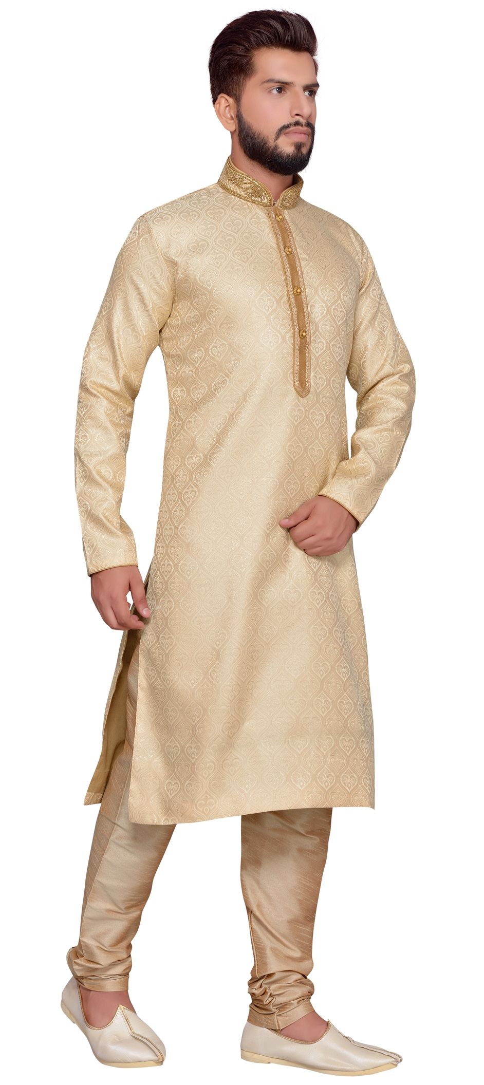 Gold color Kurta Pyjamas in Brocade fabric with Lace work