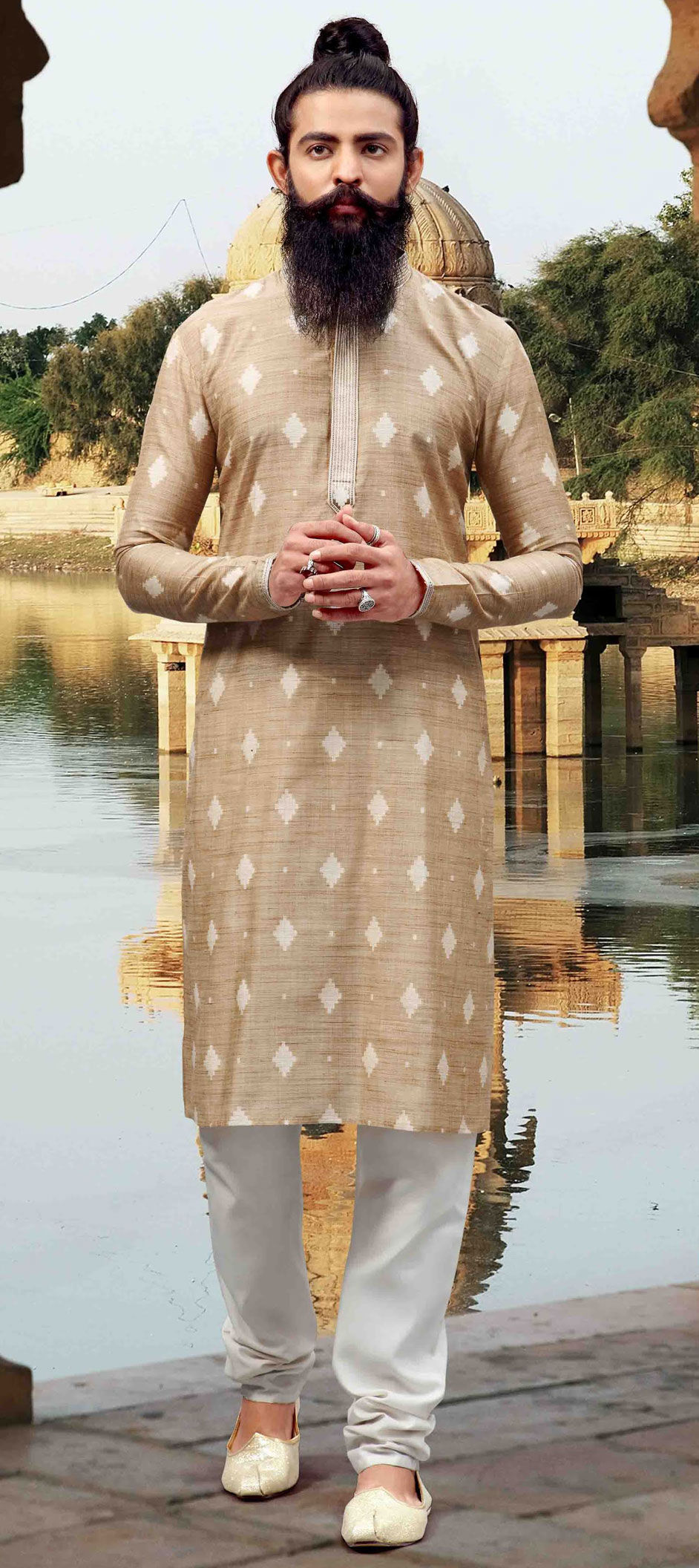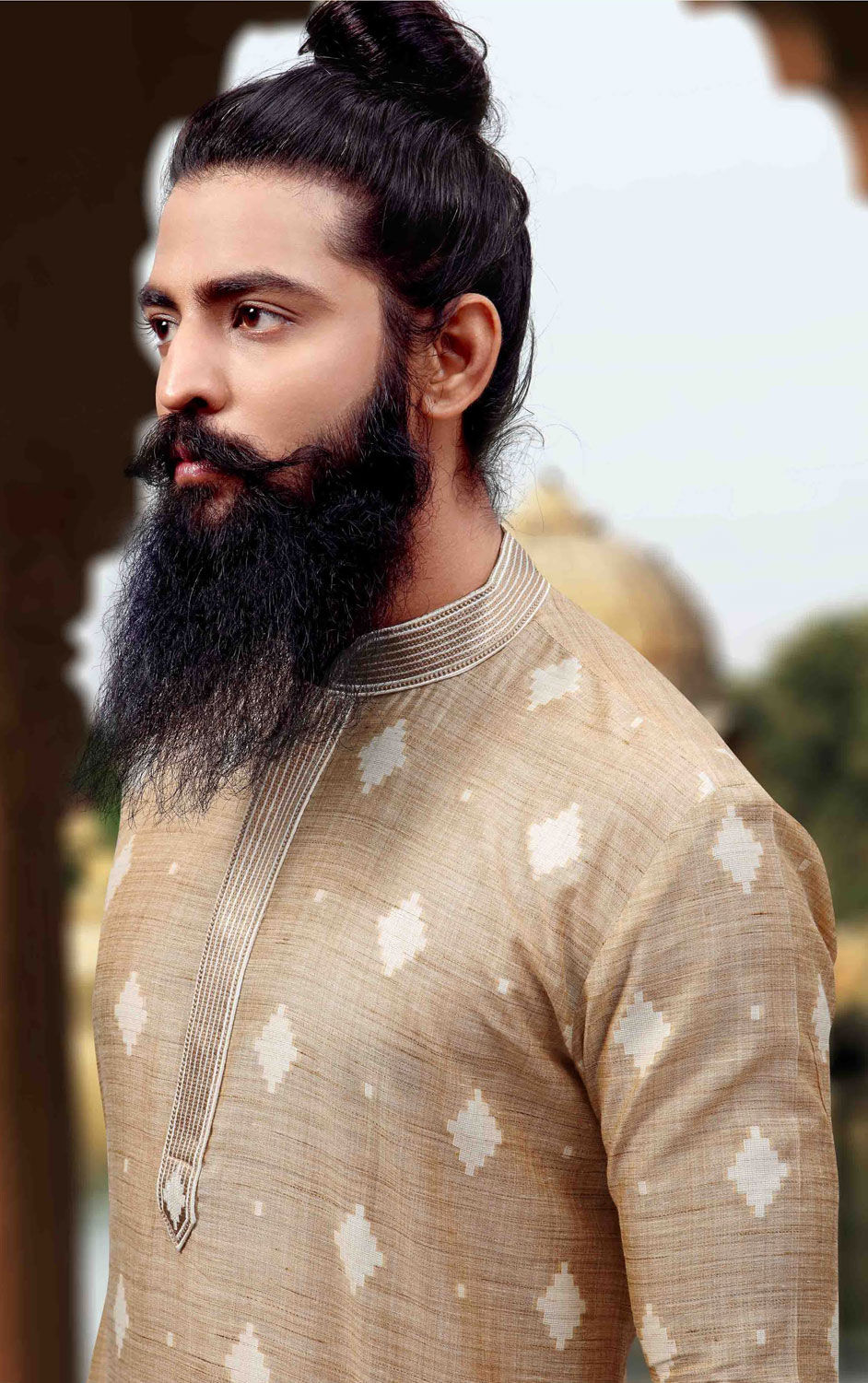 Beige and Brown color Kurta Pyjamas in Cotton fabric with Embroidered, Thread work