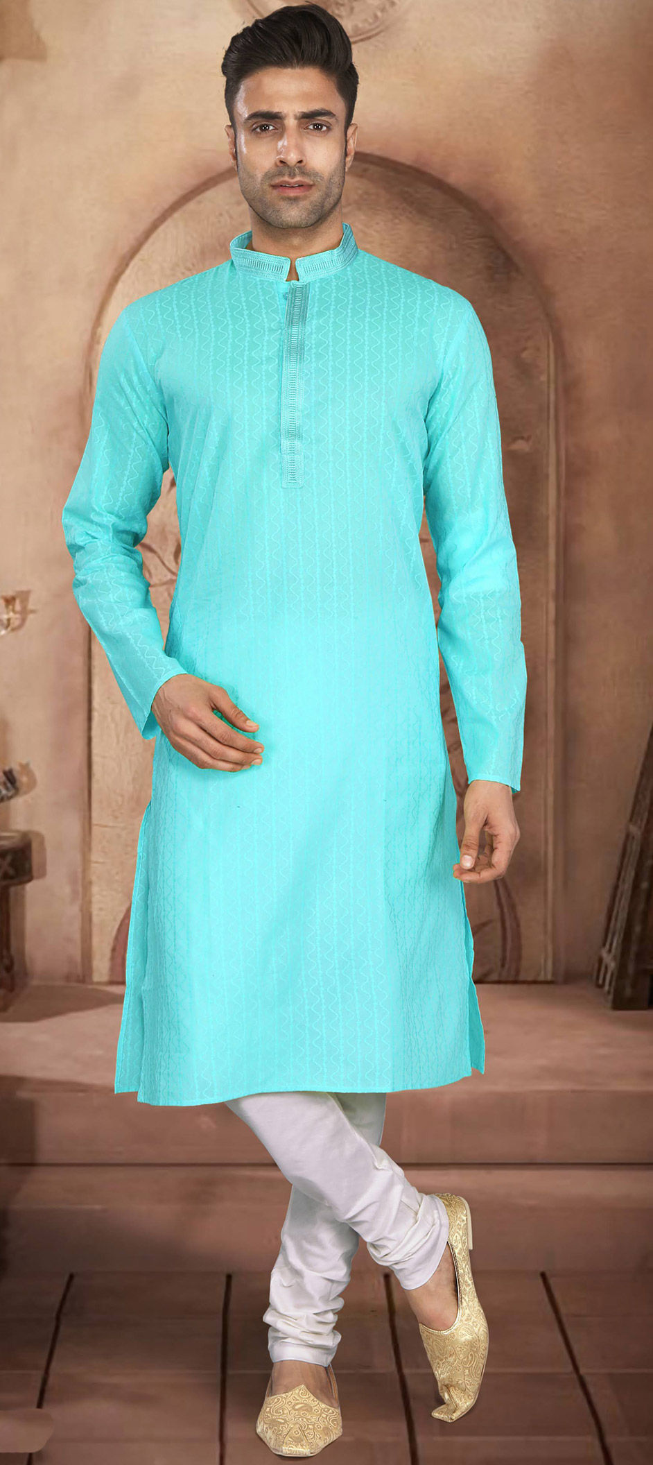 Blue color Kurta Pyjamas in Cotton fabric with Thread work