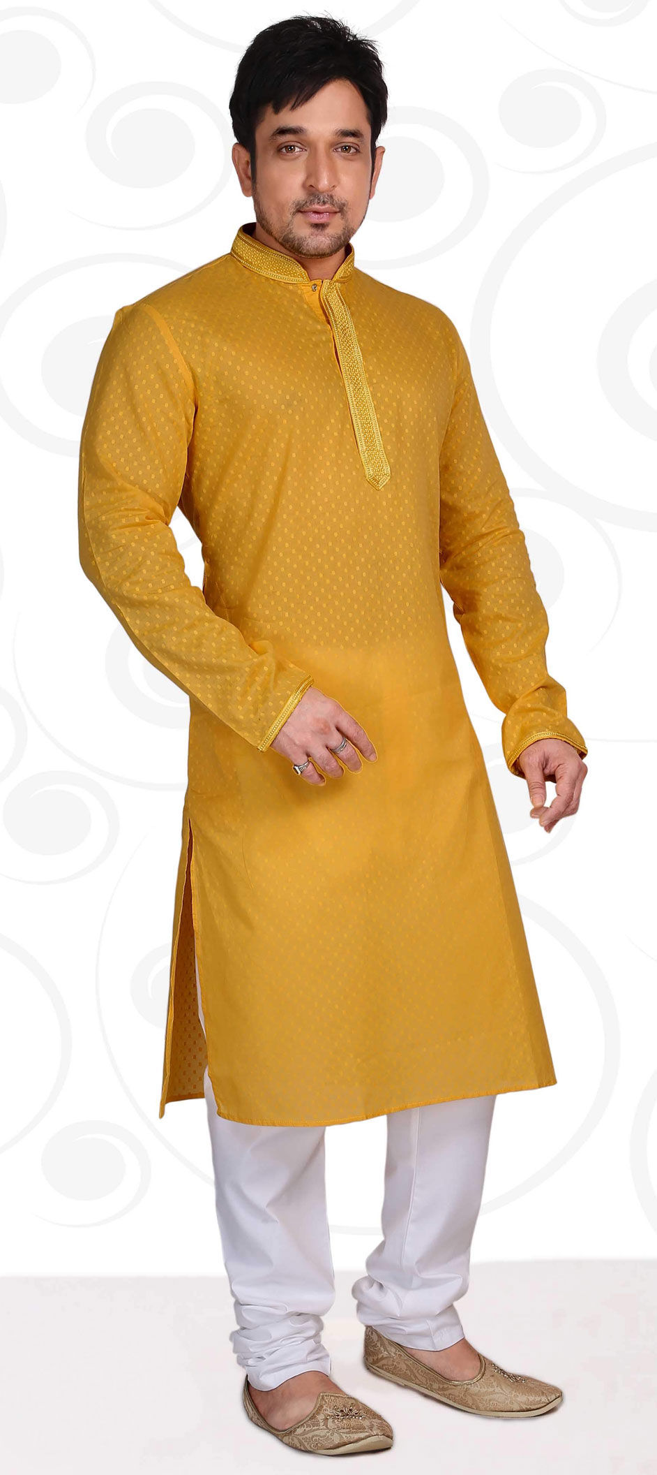 Yellow color Kurta Pyjamas in Cotton fabric with Thread work